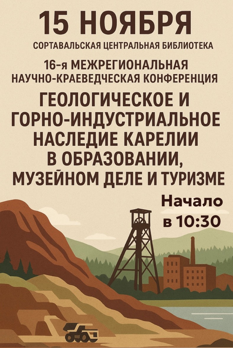 15 ноября в 10.30 в Сортавальской районной библиотеке пройдет 15-я межрегиональная научно-краеведческая конференция «Геологическое и горно-индустриальное наследие Карелии в образовании, музейном деле и туризме»