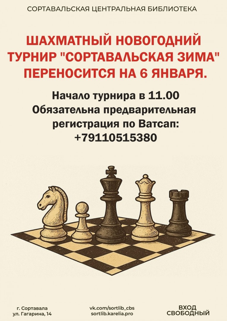6 января в 11:00 в Сортавальской центральной библиотеке состоится шахматный новогодний турнир «Сортавальская зима»
