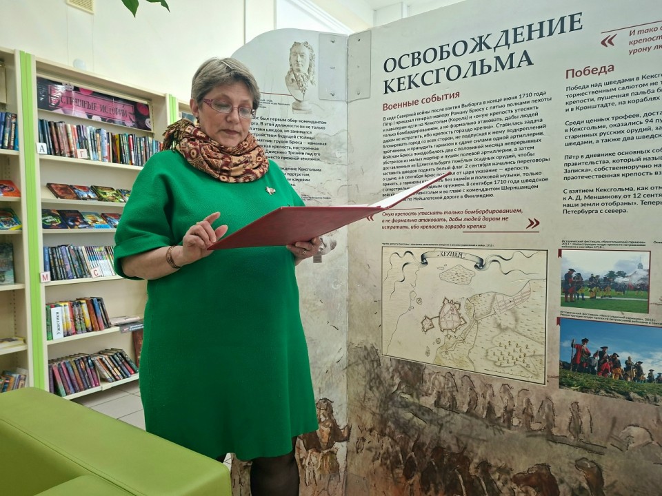 Ведущая церемонии Открытия, заведующий отделом обслуживания Сортавальской центральной библиотеки Алевтина Юрьевна Леонтьева раскрыла гостям интересные подробности фактов, о которых рассказывает выставка.