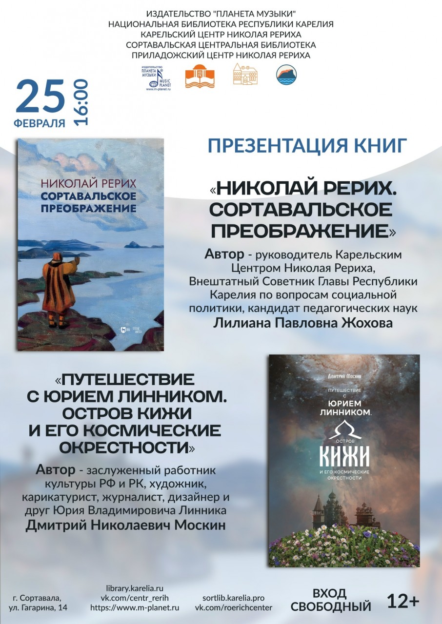 25 февраля в 16.00 в Сортавальской центральной библиотеке состоится презентация книги «Николай Рерих. Сортавальское преображение» Лилианы Павловны Жоховой и электронного варианта книги «Путешествие с Юрием Линником. Остров Кижи и его космические окрестности» Дмитрия Николаевича Москина.