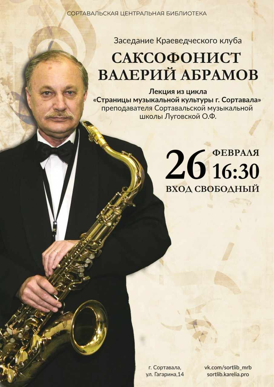 26 февраля в 16.30 краеведческий клуб при Сортавальской центральной библиотеке приглашает всех желающих на лекцию «Саксофонист Валерий Абрамов» (Из цикла «Страницы музыкальной культуры г. Сортавала»).