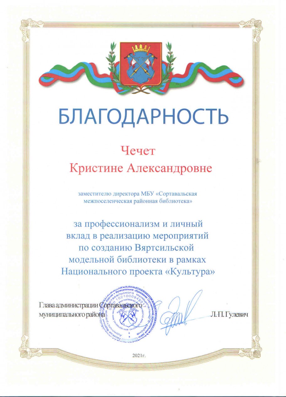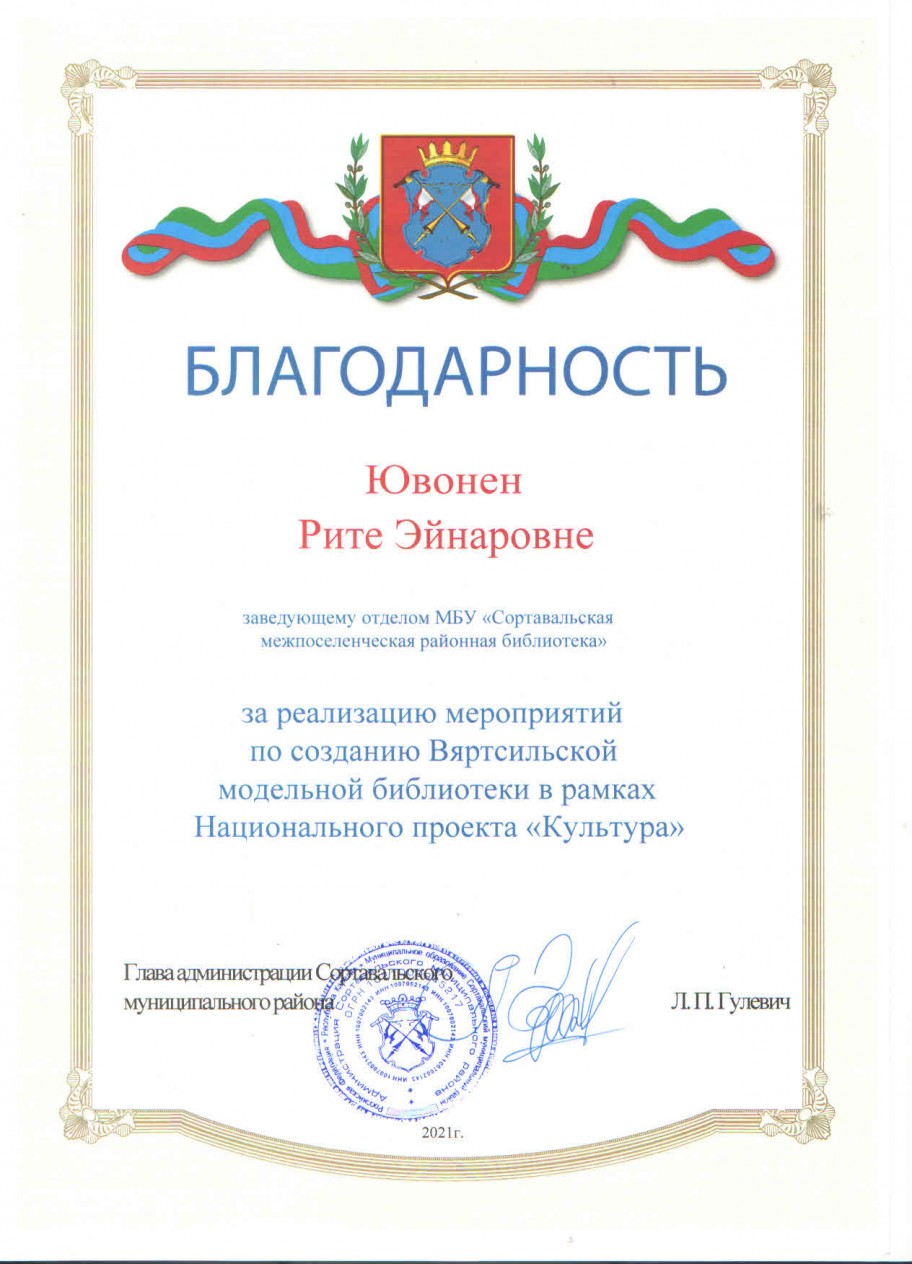 Благодарственными письмами Главы администрации Сортавальского муниципального района за профессионализм и личный вклад в реализацию мероприятий по созданию Вяртсильской модельной библиотеки в рамках национального проекта «Культура»были отмечены: