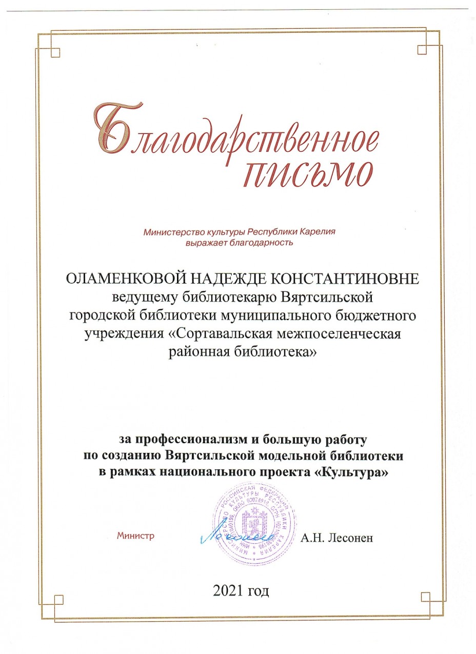 - Оламенковой Надежде Константиновне, ведущему библиотекарю Вяртсильской городской библиотеки муниципального бюджетного учреждения «Сортавальская межпоселенческая районная библиотека», за профессионализм и большую работу по созданию Вяртсильской модельной библиотеки.