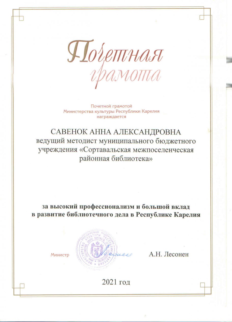 Почетной грамотой Министерства культуры Республики Карелия Савенок Анна Александровна, ведущий методист муниципального бюджетного учреждения «Сортавальская межпоселенческая районная библиотека», за высокий профессионализм и большой вклад в развитие библиотечного дела в Республике Карелия.