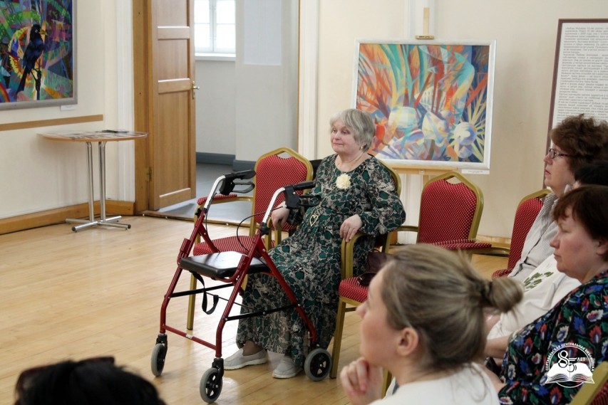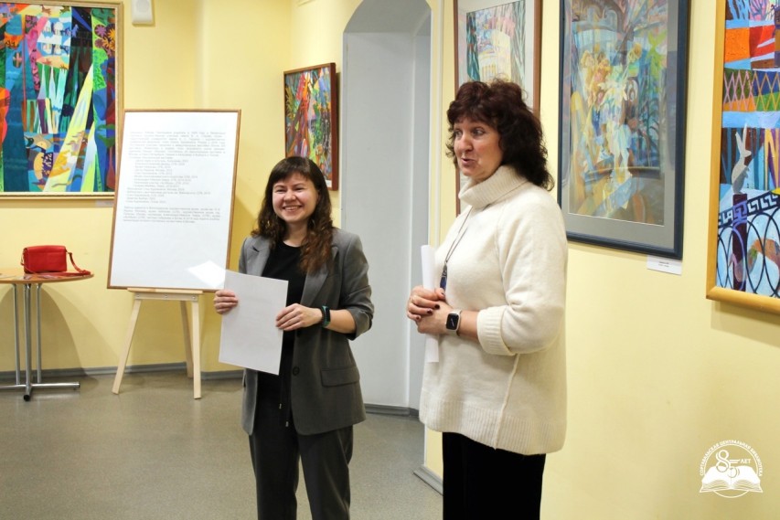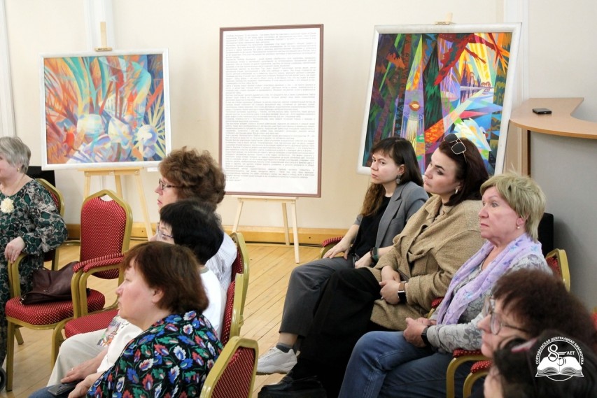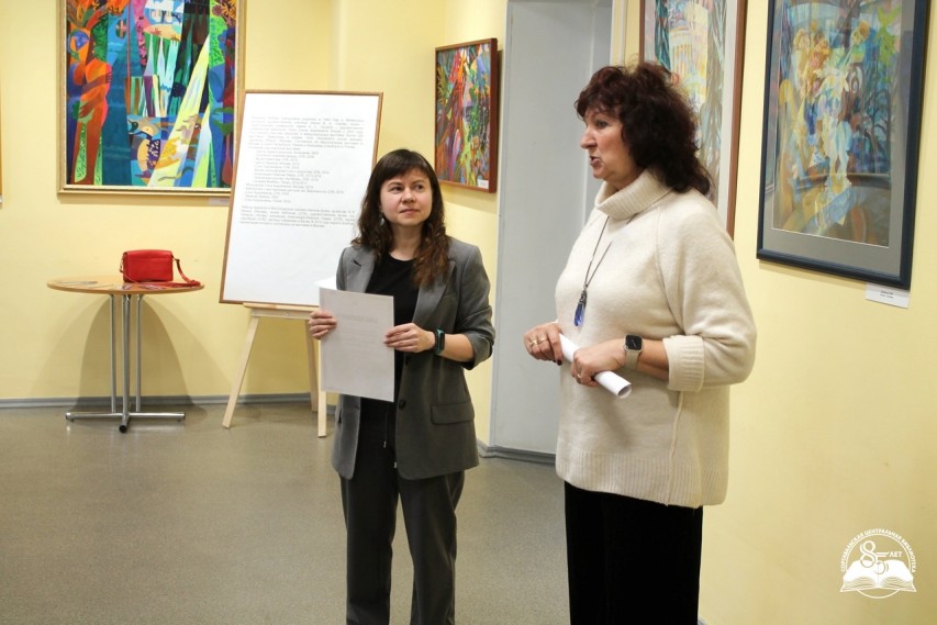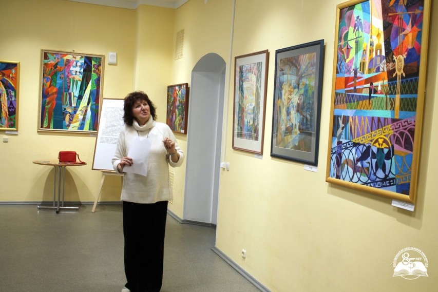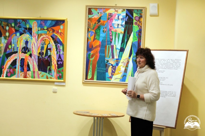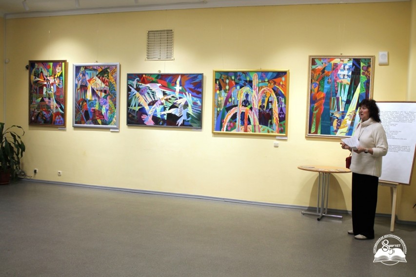 В конференц-зале библиотеки располагаются метафорические полотна, располагающие к размышлениям о сущности человеческого бытия. Вторая часть экспозиции посвящена Санкт-Петербургу, любимому городу художницы. Увидеть необычно яркий образ северной столицы, можно в 101 кабинете (1 этаж).