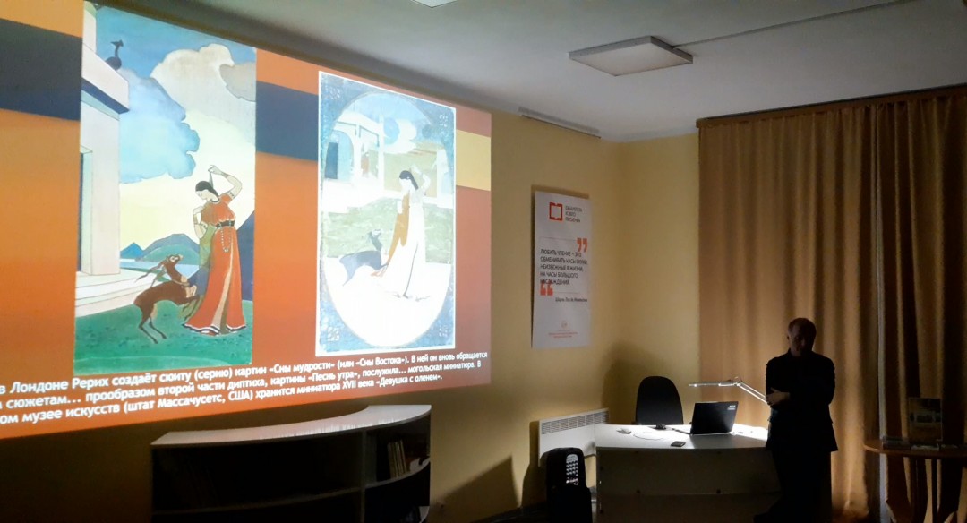 30 ноября в Сортавальской библиотеке прошел Art-час «Индийские зарисовки в творчестве Н.К.Рериха». Его ведущий, научный сотрудник Санкт-Петербургского государственного музея-института семьи Рерихов Дмитрий Витальевич Делюкин, рассказал об основных художественных мотивах, которые связывают полотна Николая Константиновича и древнюю храмовую живопись Индии.