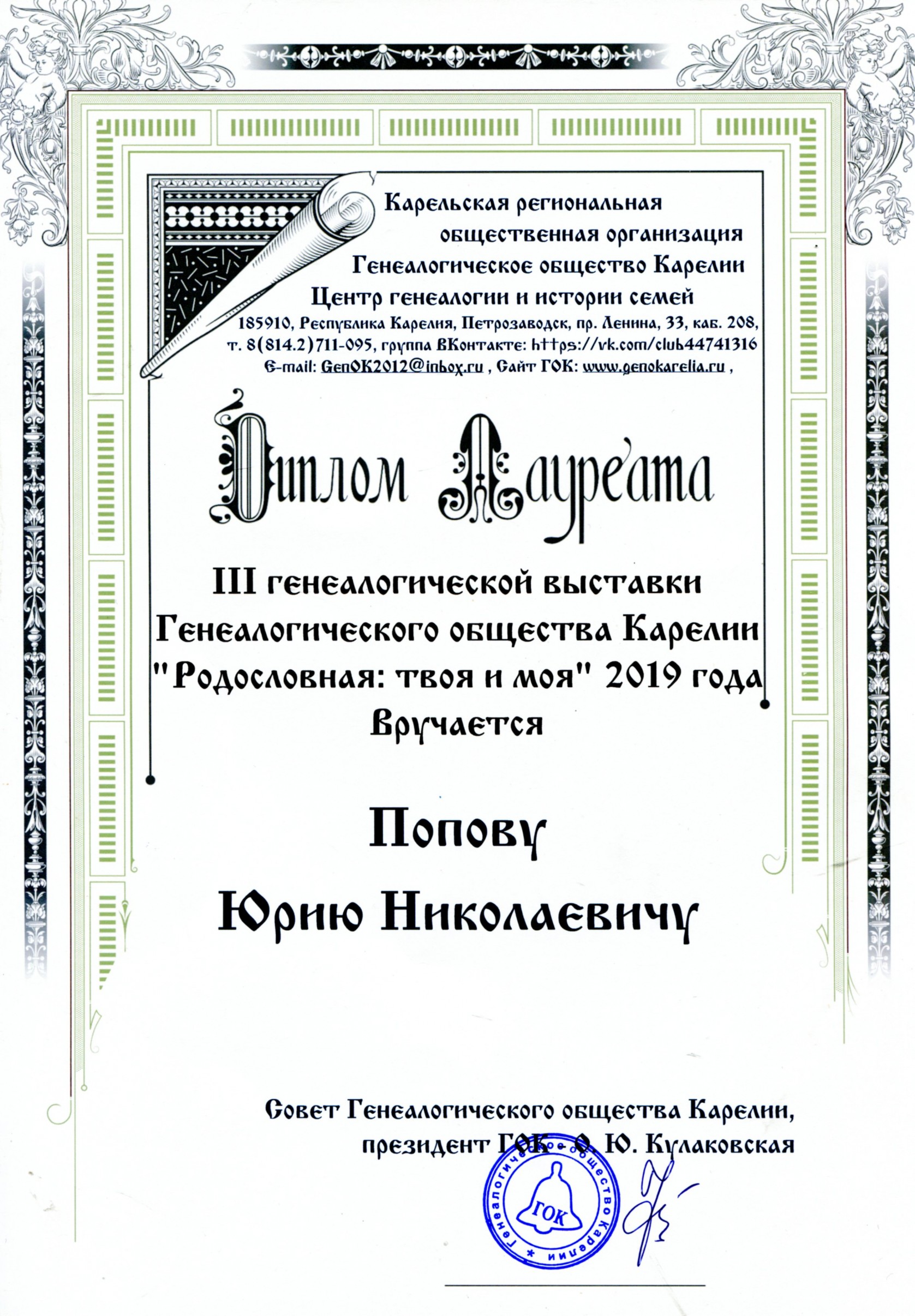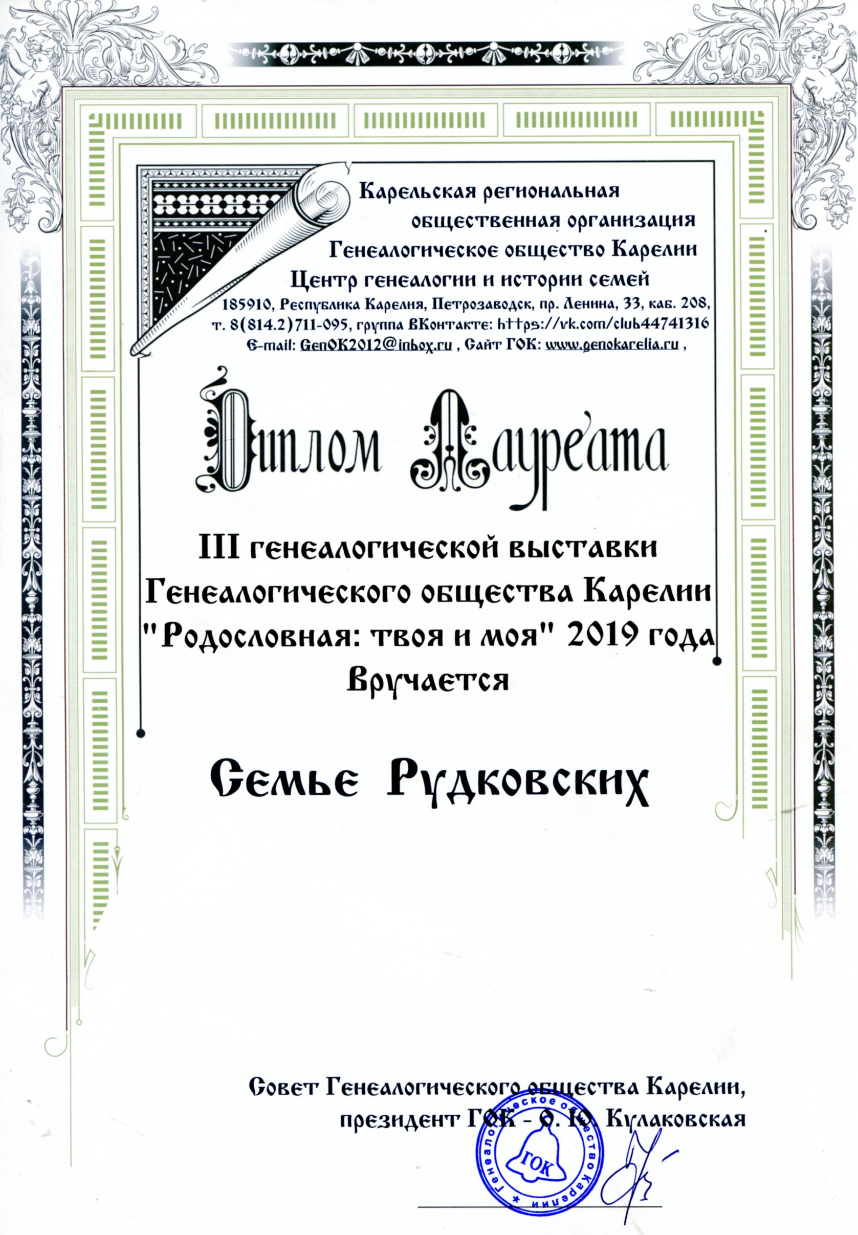 Также были вручены дипломы лауреатам III генеалогической выставки Генеалогического общества Карелии «Родословная: твоя и моя», проходившей в 2019 году. Ими стали Попов Юрий Николаевич и семья Рудковских. От души поздравляем наших исследователей с заслуженной наградой.