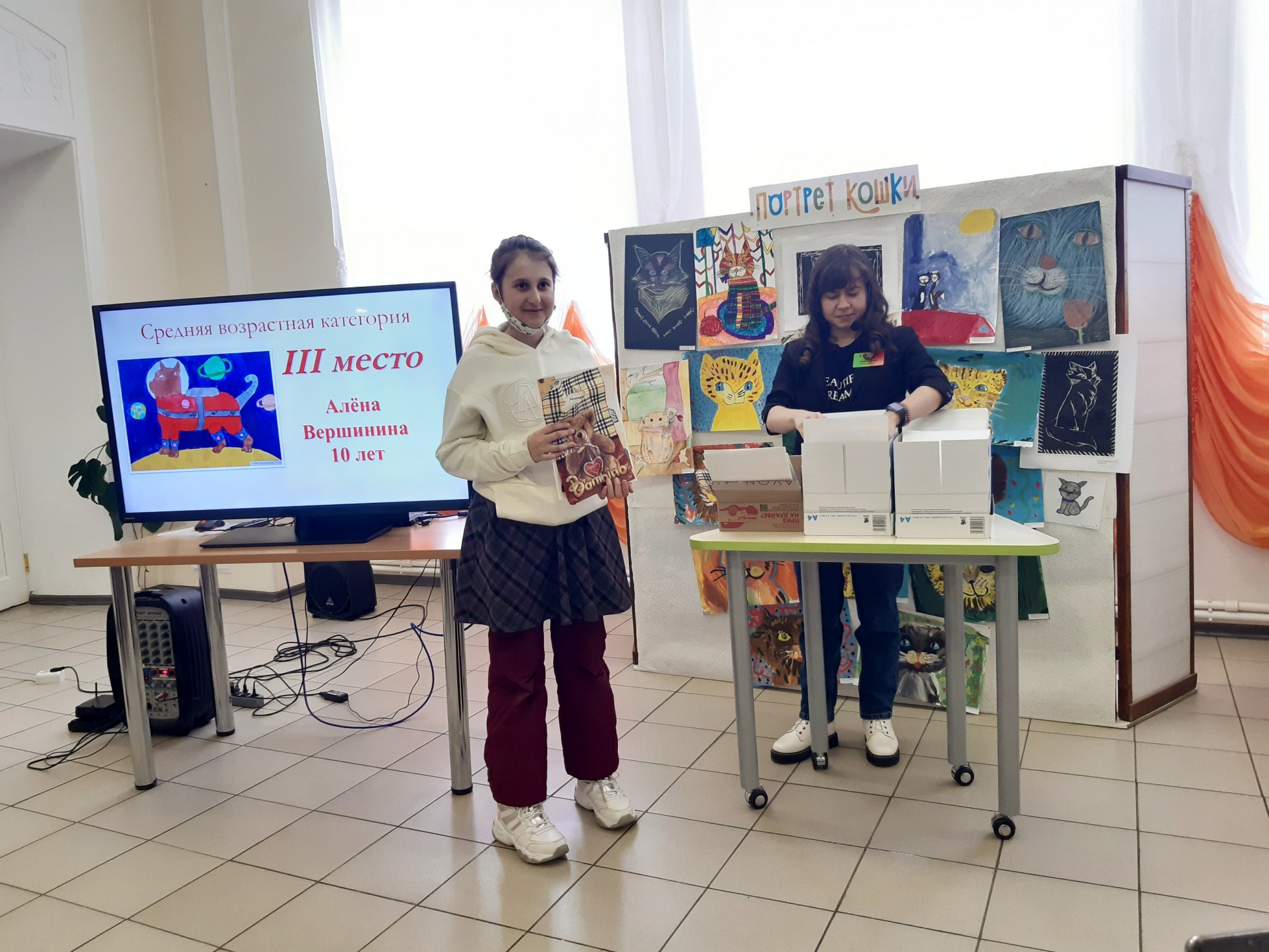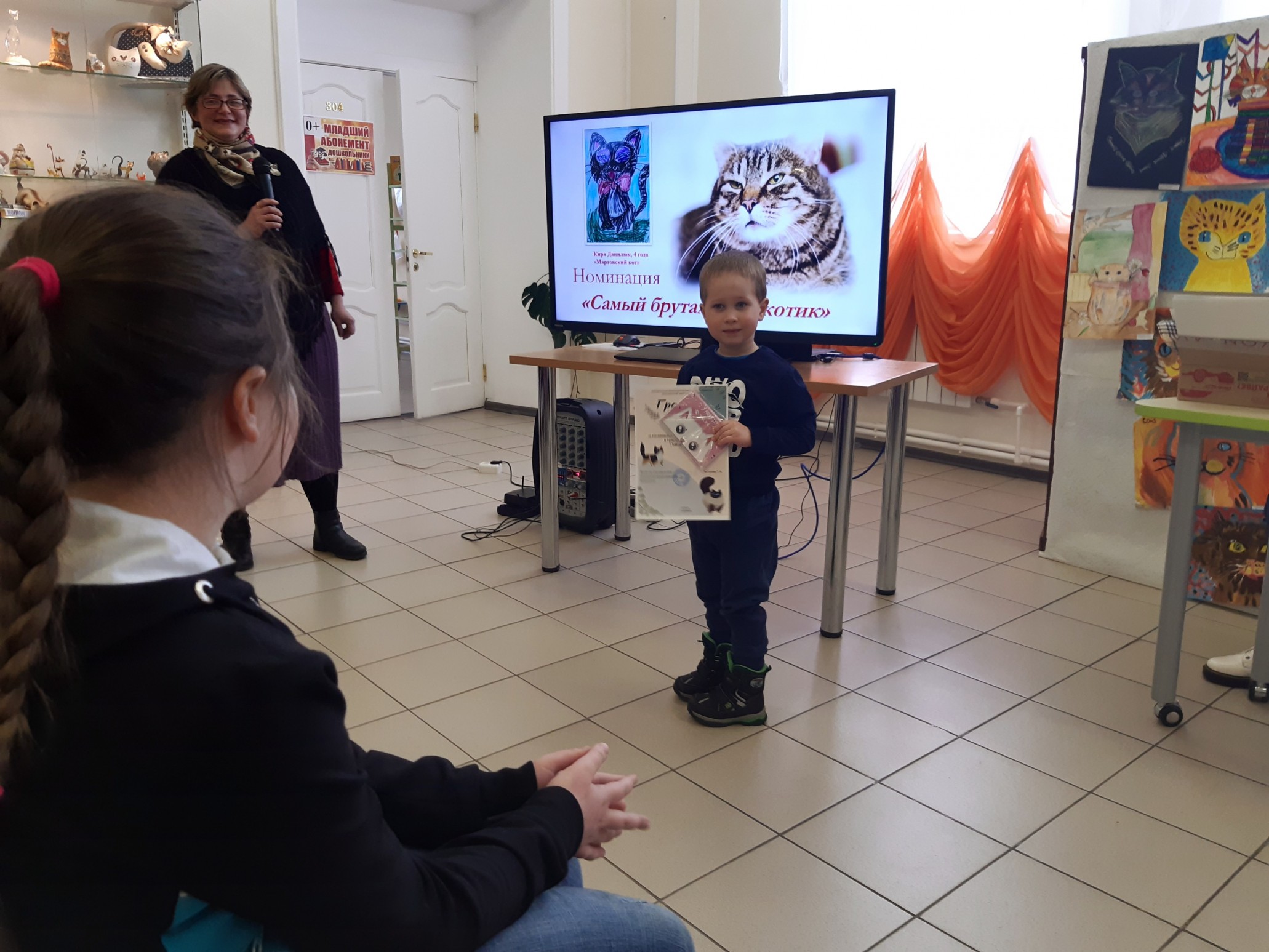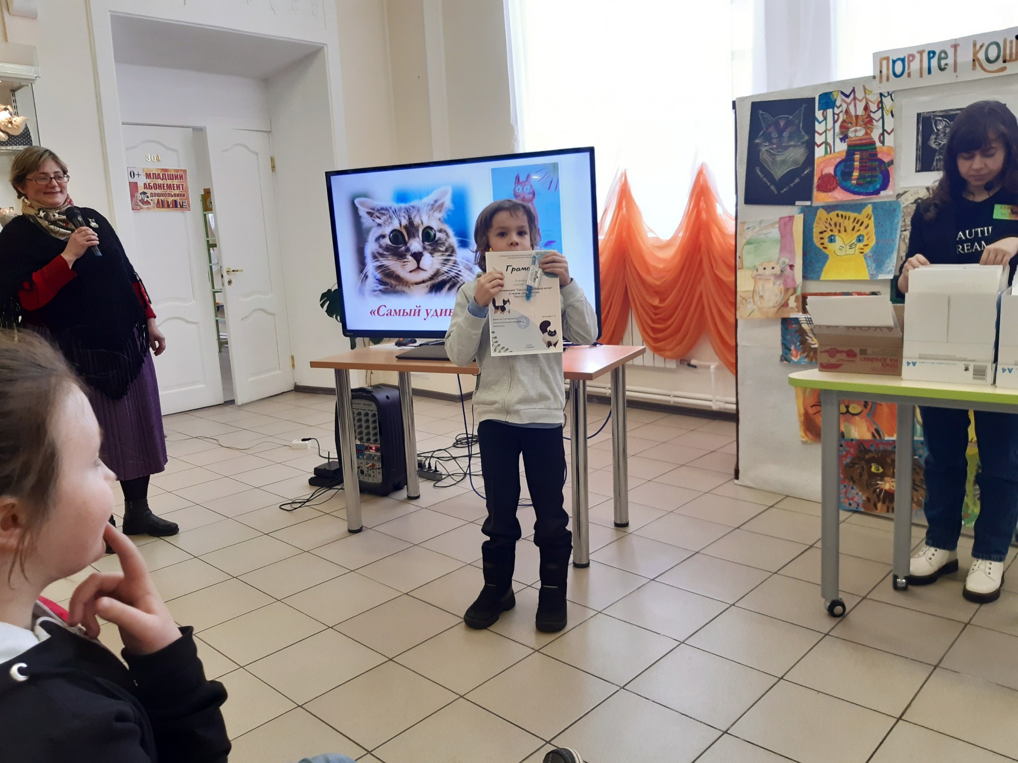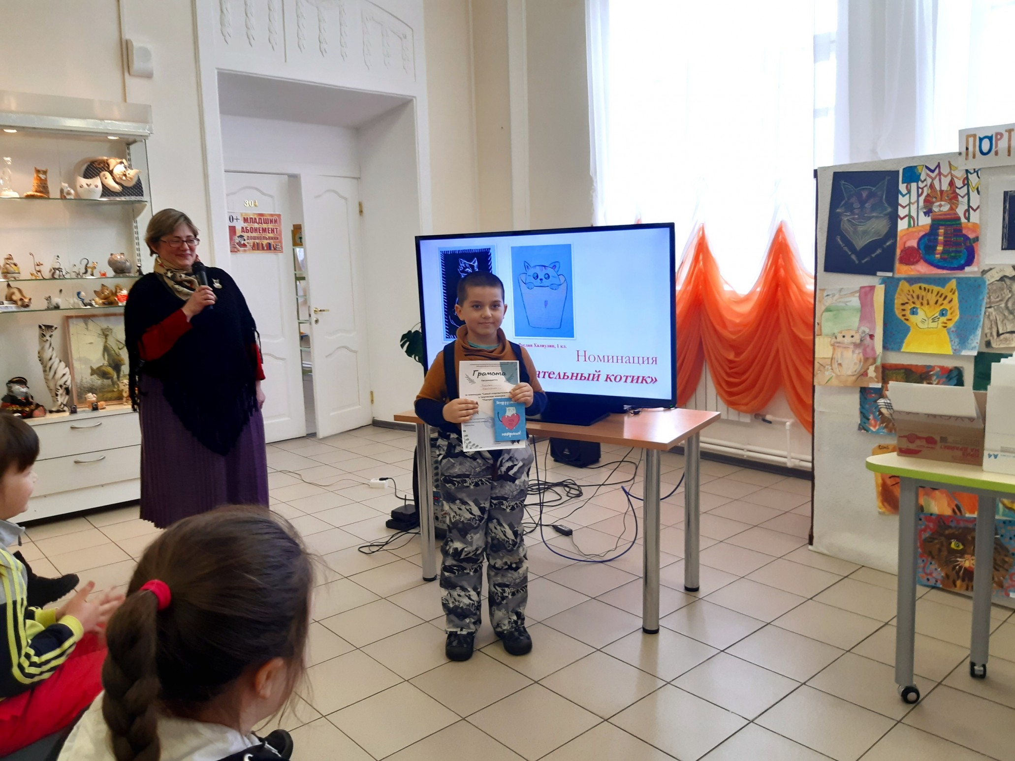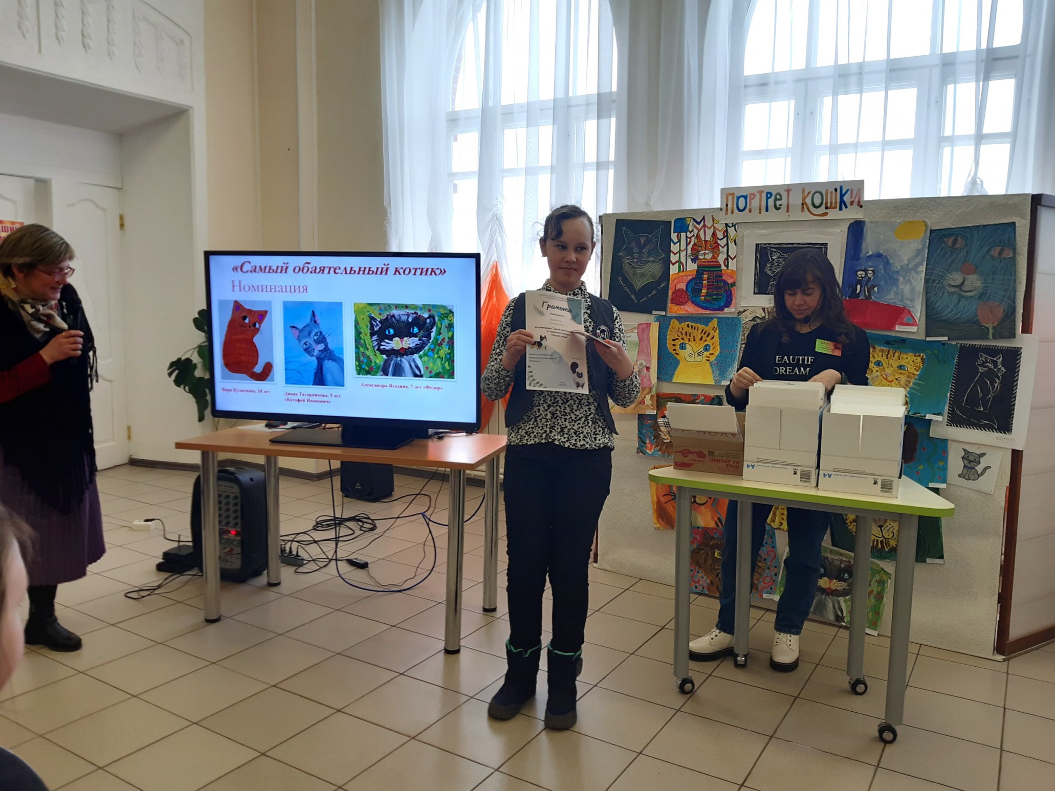 Финальным аккордом вечера стала официальная церемония подведения итогов конкурса детского рисунка и видеороликов «Портрет кошки», которую провела его координатор, заведующий Приладожским центром Н.К.Рериха, Егошина Юлия Сергеевна.