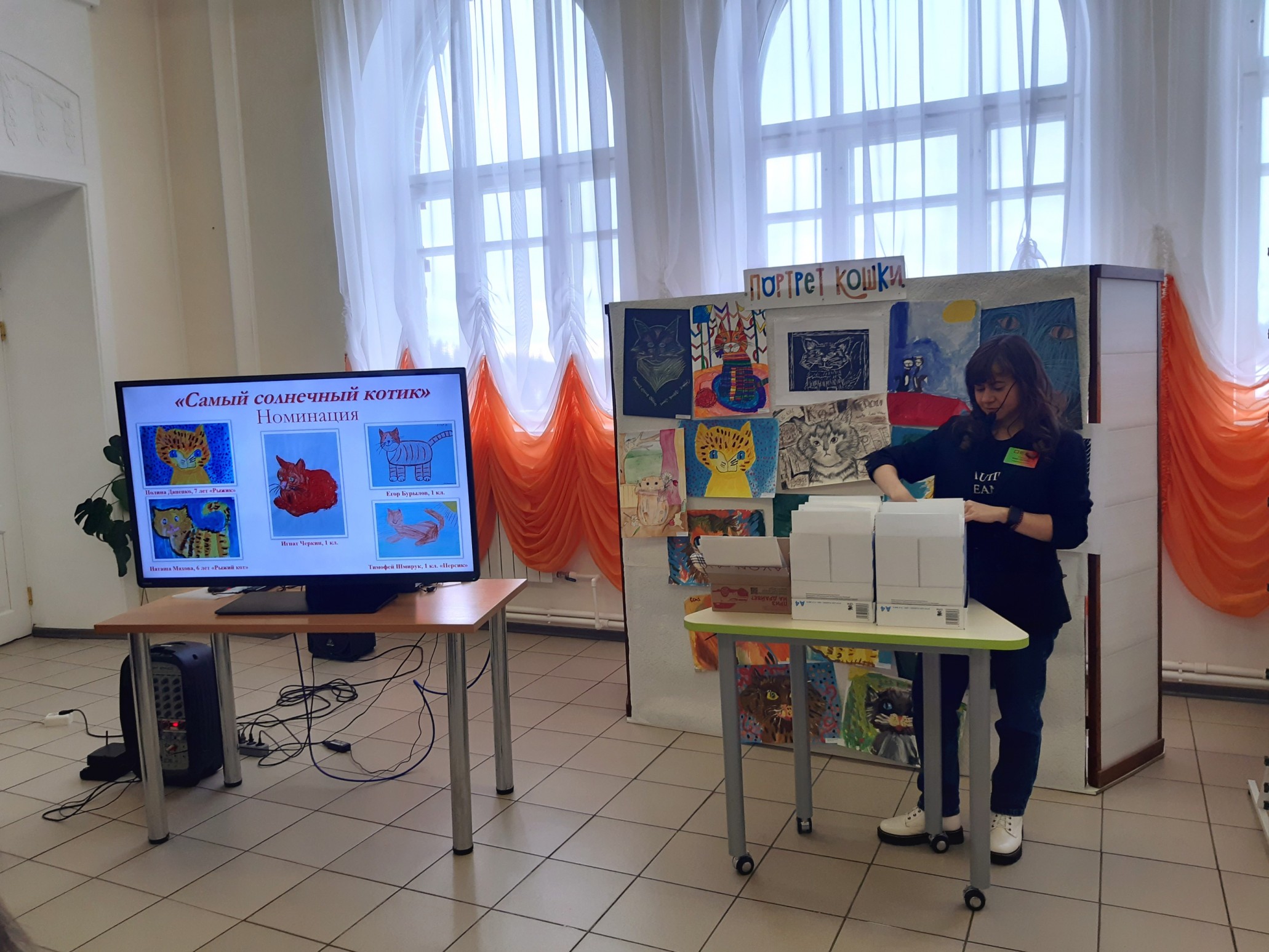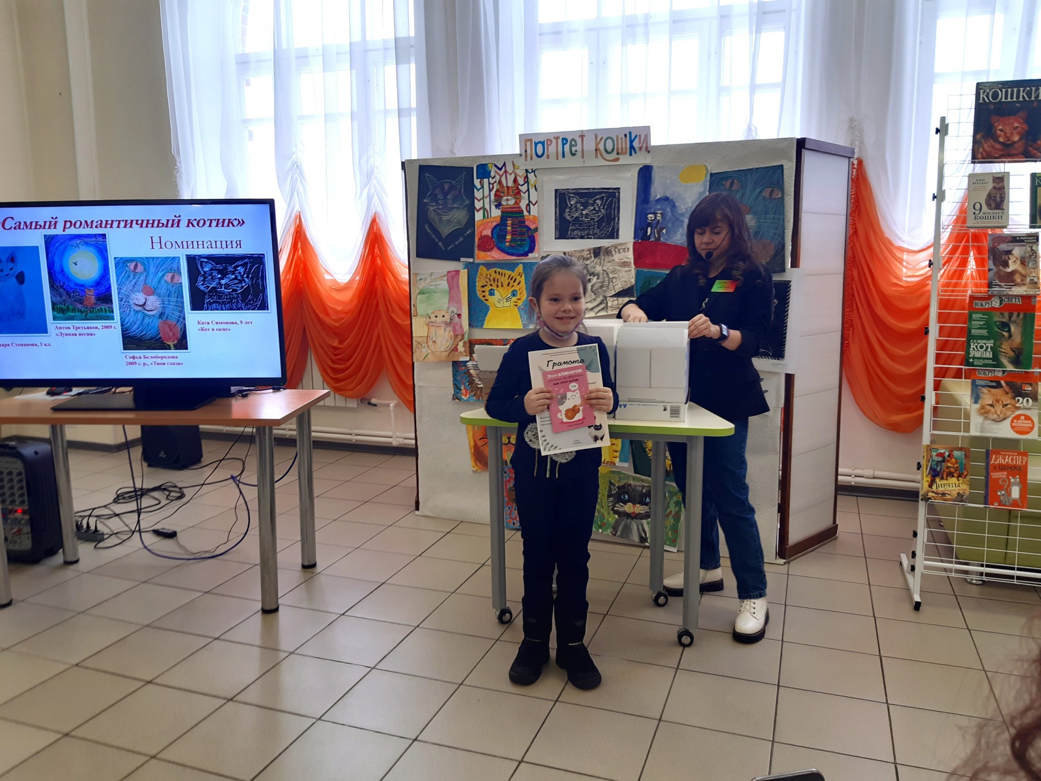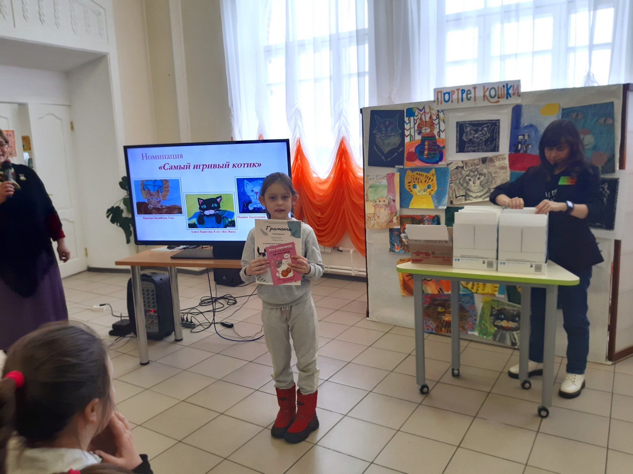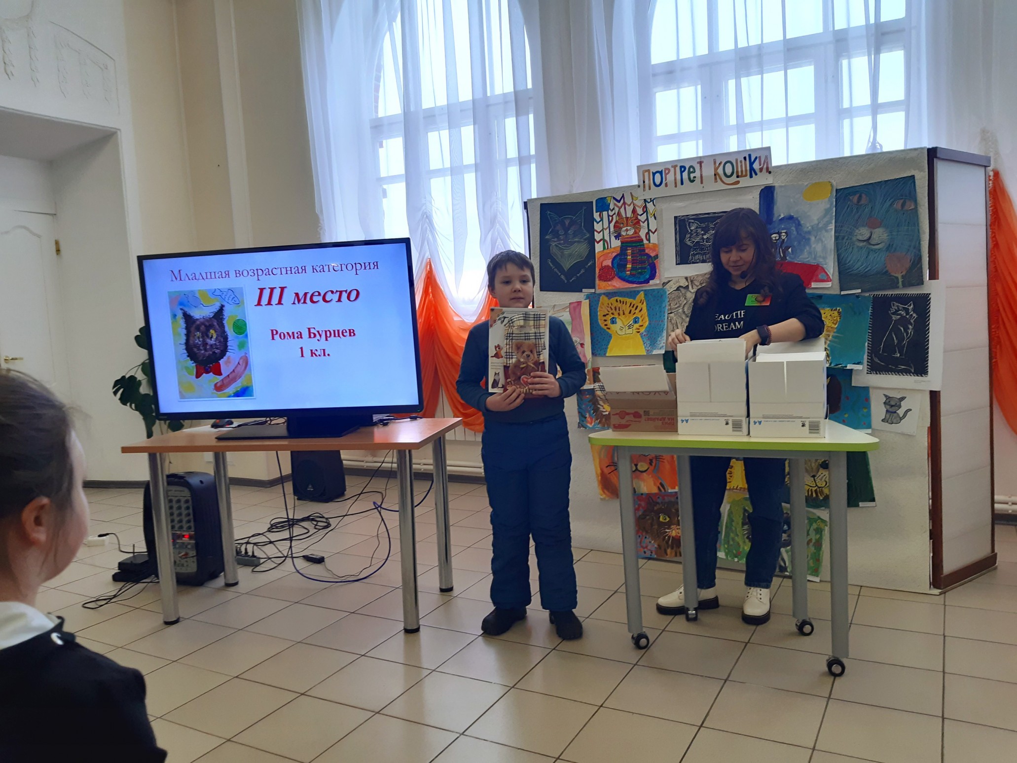 Финальным аккордом вечера стала официальная церемония подведения итогов конкурса детского рисунка и видеороликов «Портрет кошки», которую провела его координатор, заведующий Приладожским центром Н.К.Рериха, Егошина Юлия Сергеевна.