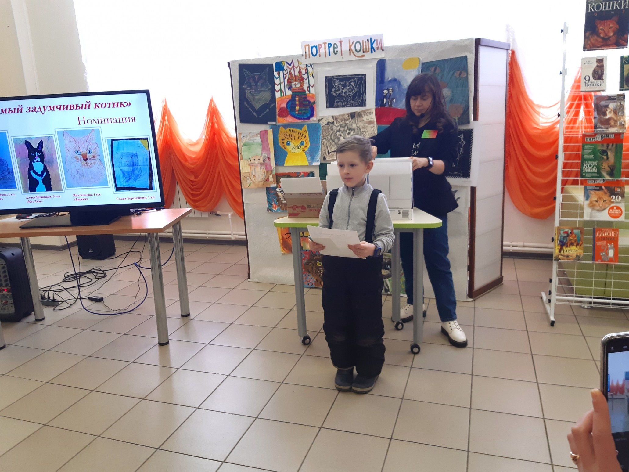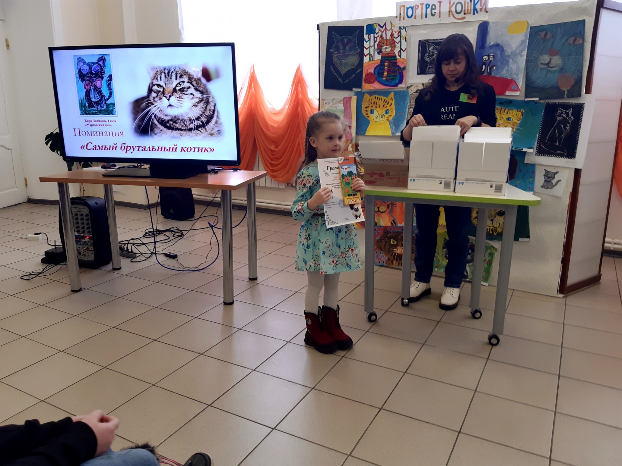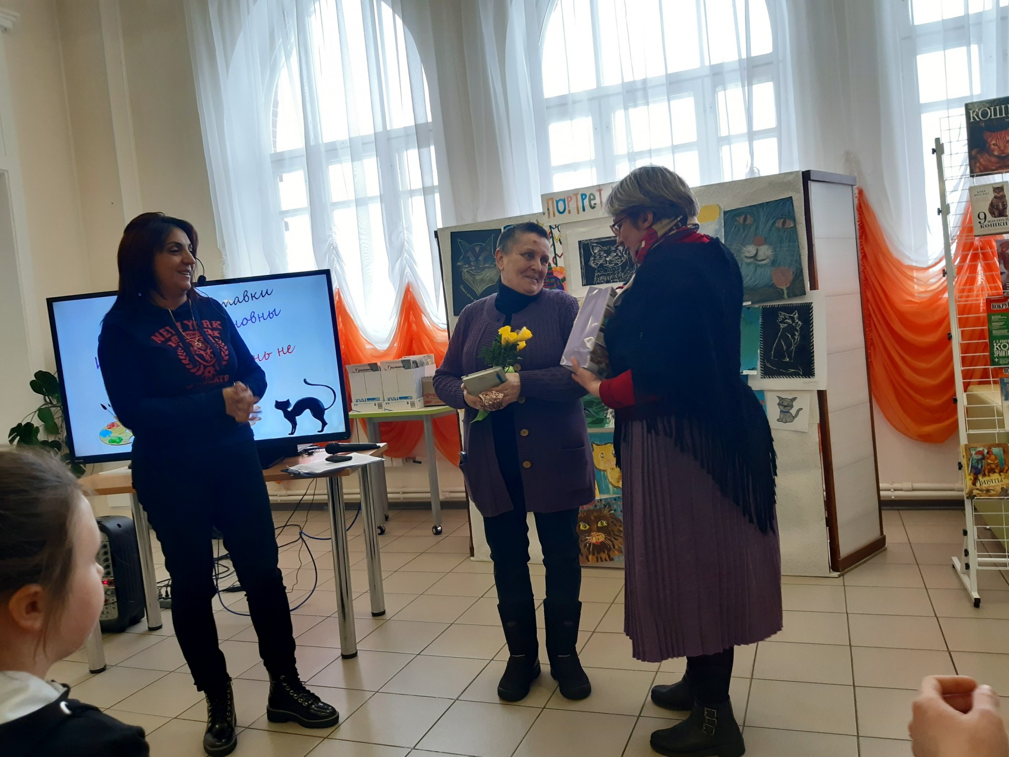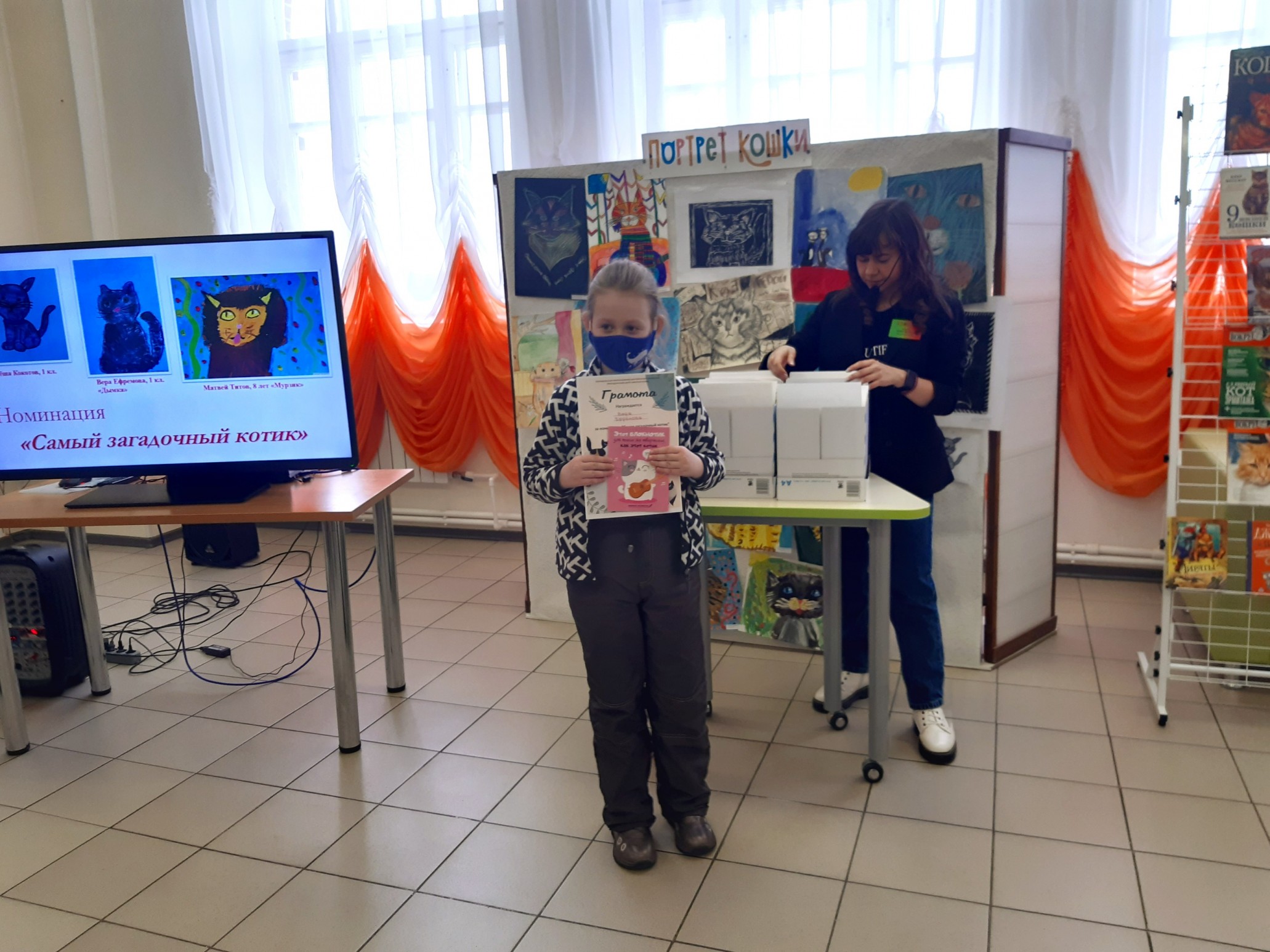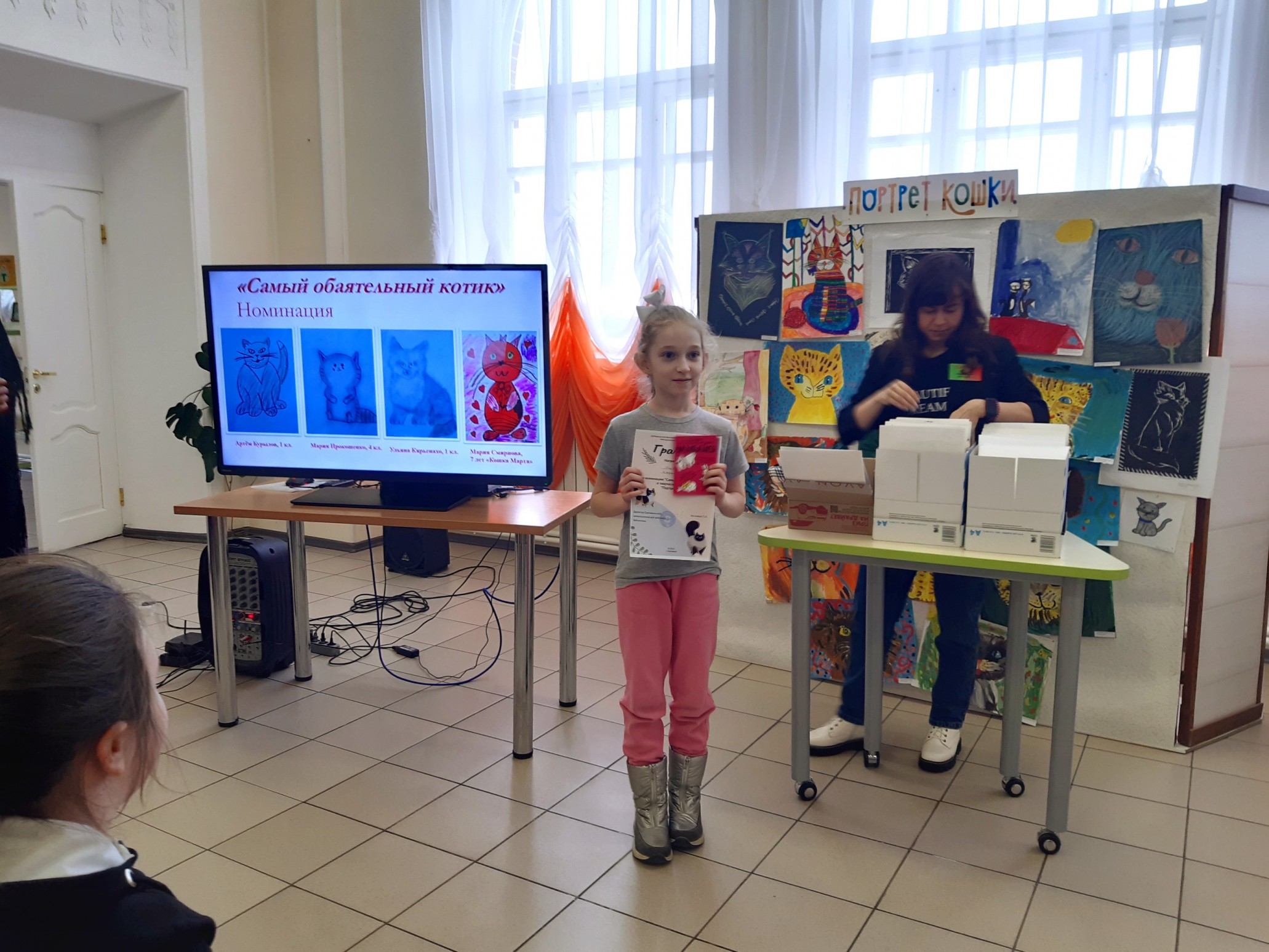 Финальным аккордом вечера стала официальная церемония подведения итогов конкурса детского рисунка и видеороликов «Портрет кошки», которую провела его координатор, заведующий Приладожским центром Н.К.Рериха, Егошина Юлия Сергеевна.