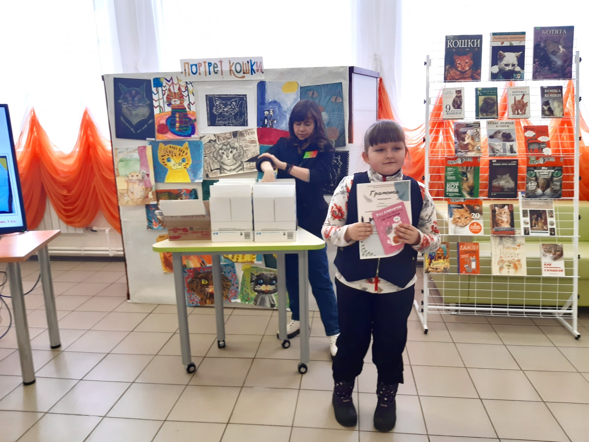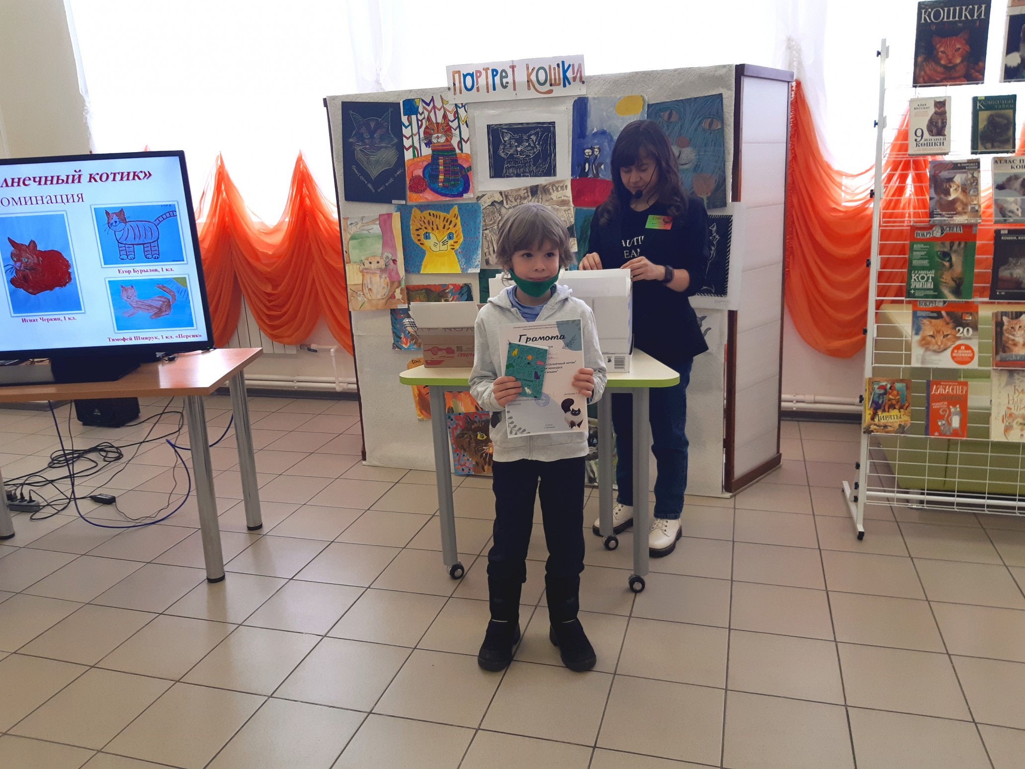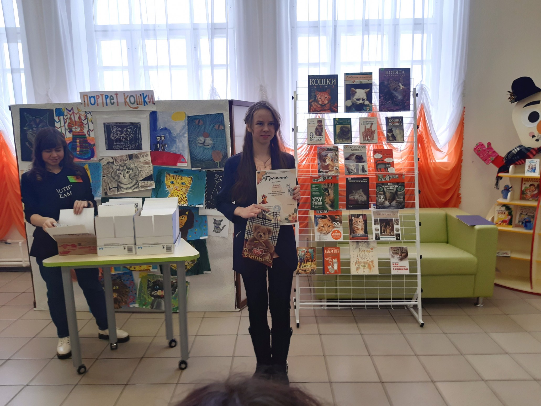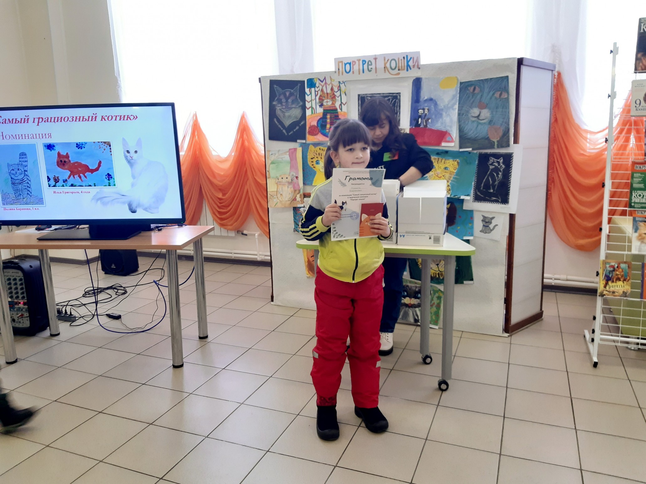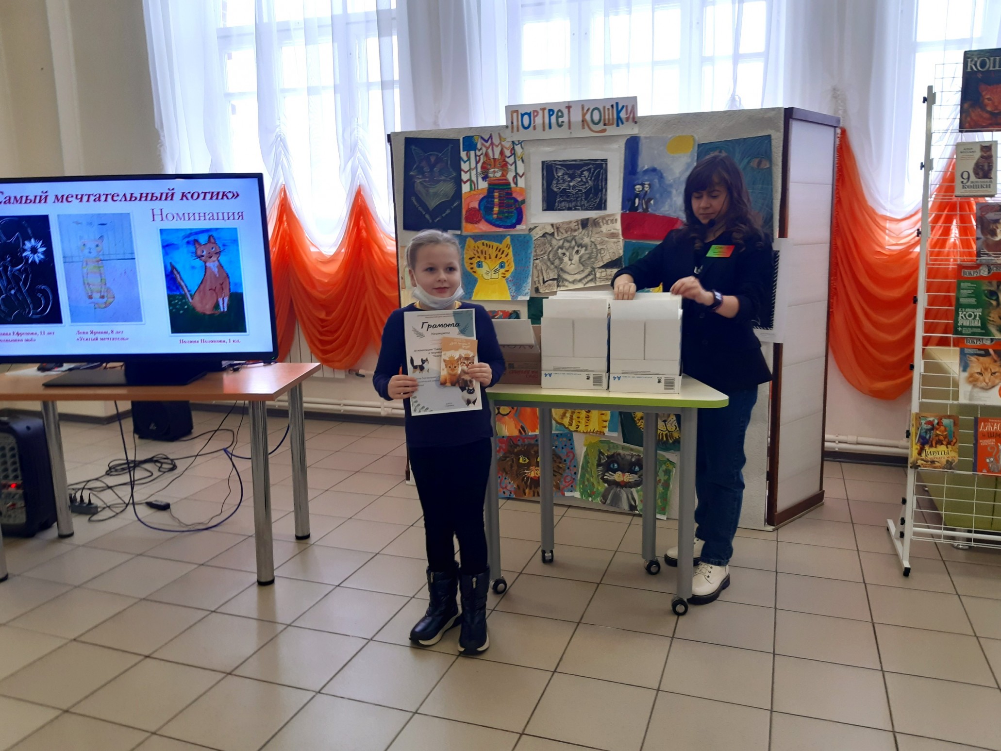 Финальным аккордом вечера стала официальная церемония подведения итогов конкурса детского рисунка и видеороликов «Портрет кошки», которую провела его координатор, заведующий Приладожским центром Н.К.Рериха, Егошина Юлия Сергеевна.
