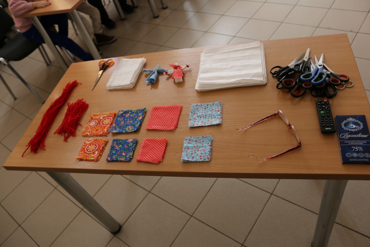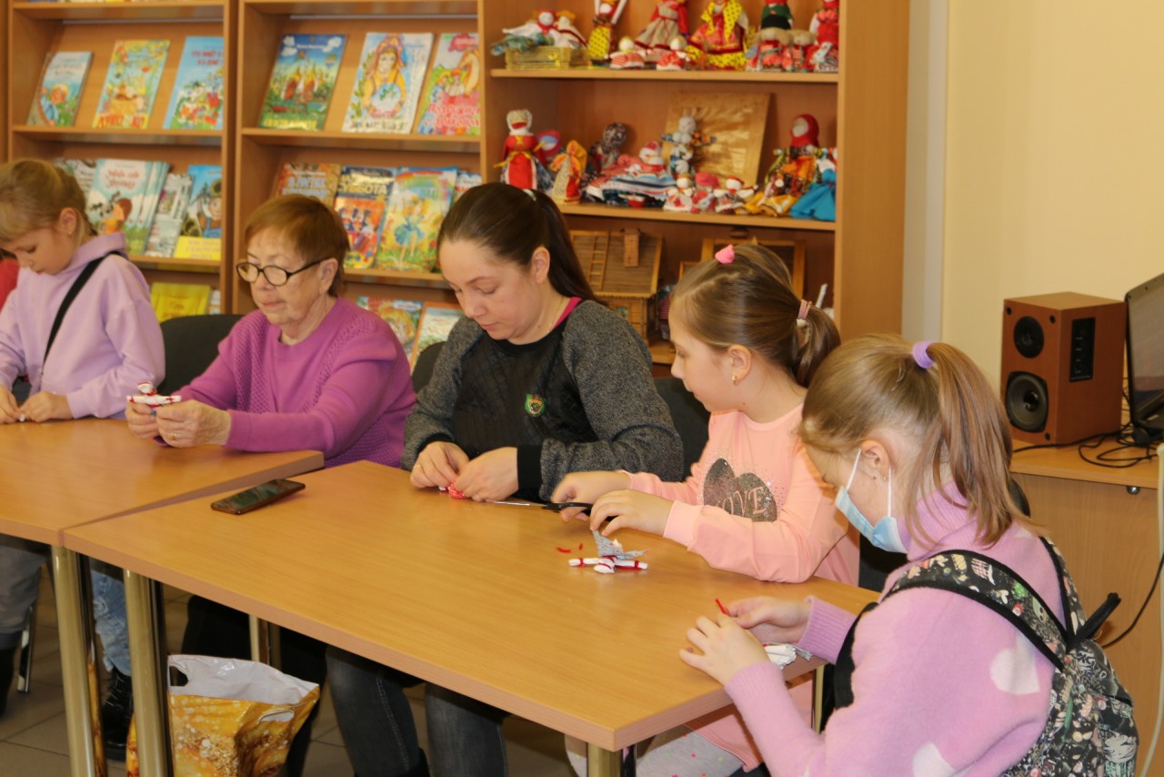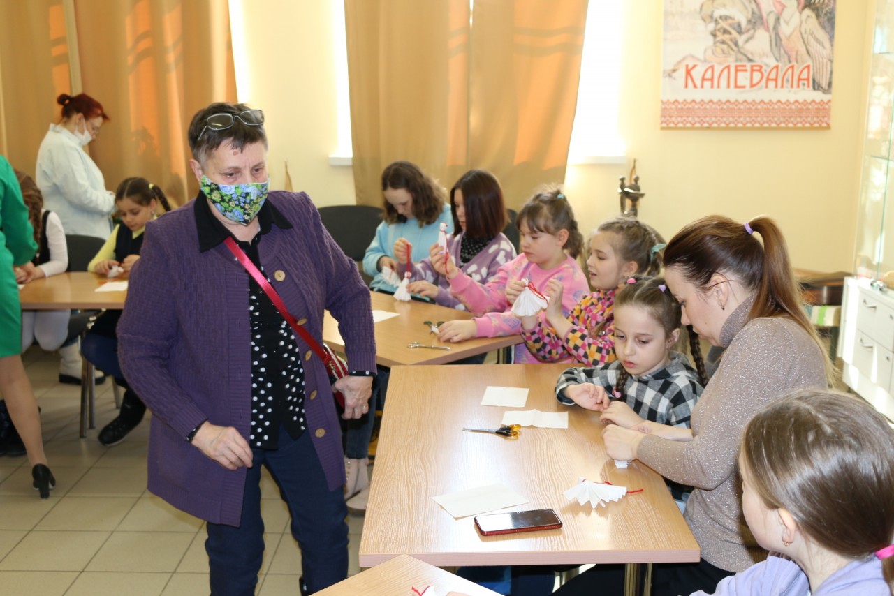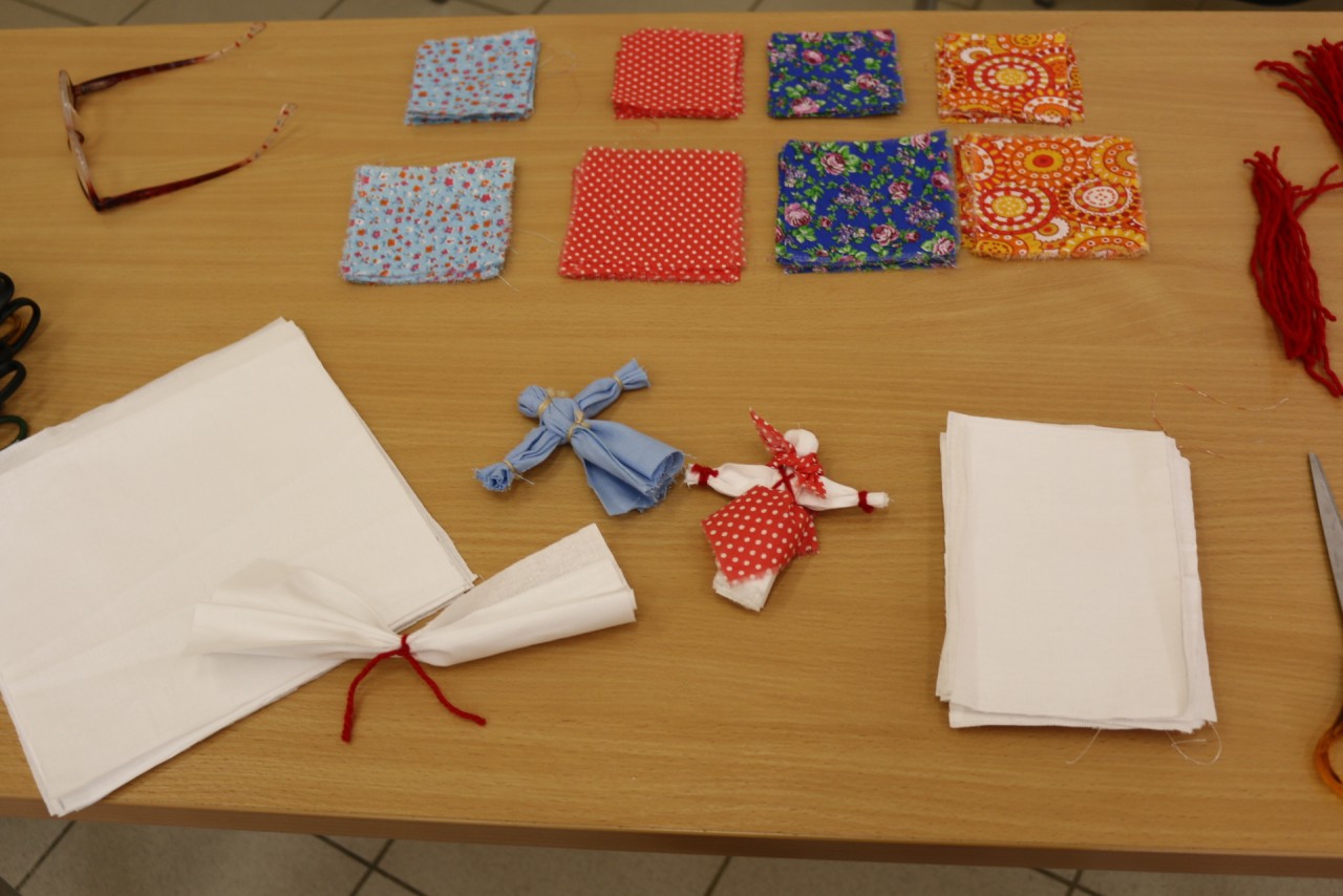 Оказывается, занятие по изготовлению куклы увлекательно для людей всех возрастов. Поэтому пришли от мала до велика, и мальчики и девочки, и по одному и семьями. Ишукова Т. В. рассказала и показала фильм о видах карельской куклы и их назначении. Зрители с интересом и удивлением открыли для себя много нового. Ведь обереговая кукла – это не просто голова, ручки и ножки. В ней вложен большой духовный смыл. О чём будешь думать во время создания куклы, такую энергию она и понесёт. Вот с добрыми мыслями все и приступили к работе. Гости очень старались. Взрослые помогали малышам завязывать узелочки. Несмотря на то, что материал у всех был одинаковый, куклы получились разные. Это и правильно. Ведь и мы все разные. Во все времена кукла не только оберегала и развлекала ребёнка, но и учила будущей взрослой жизни.