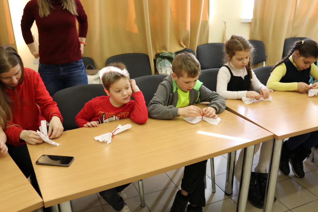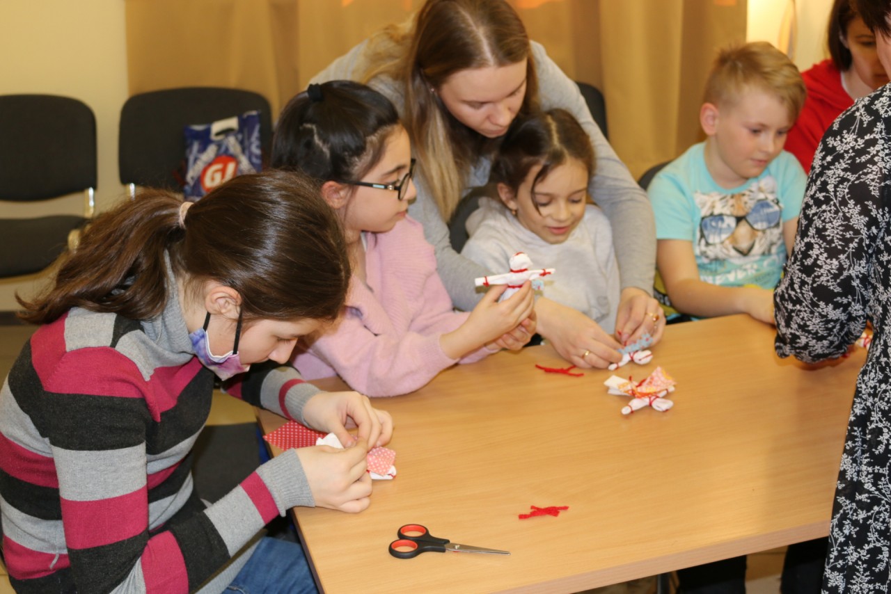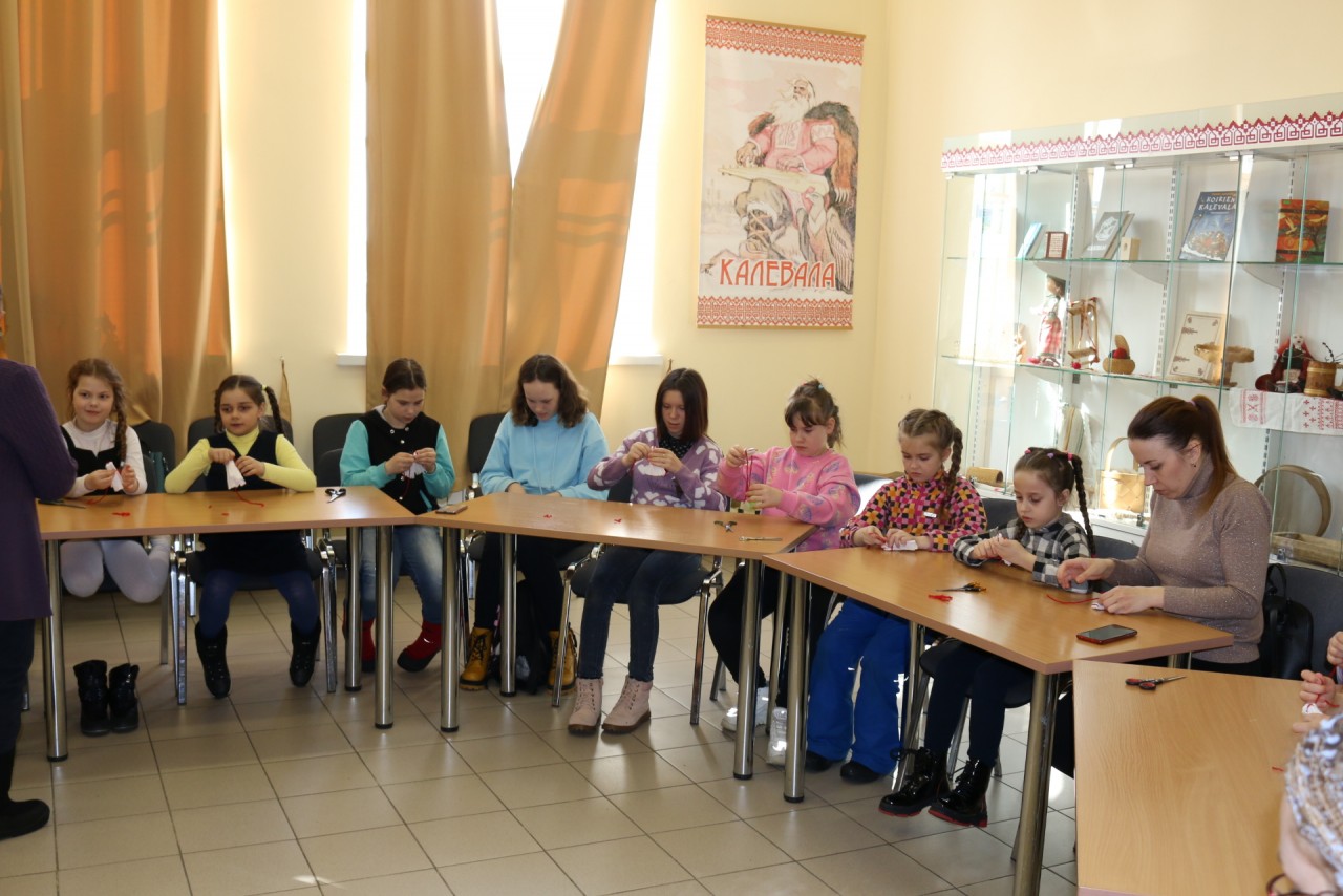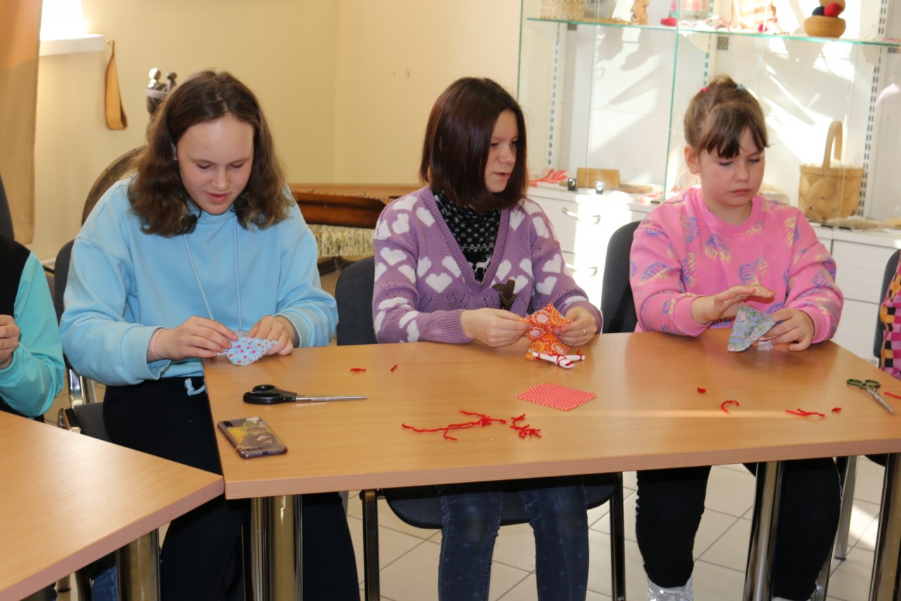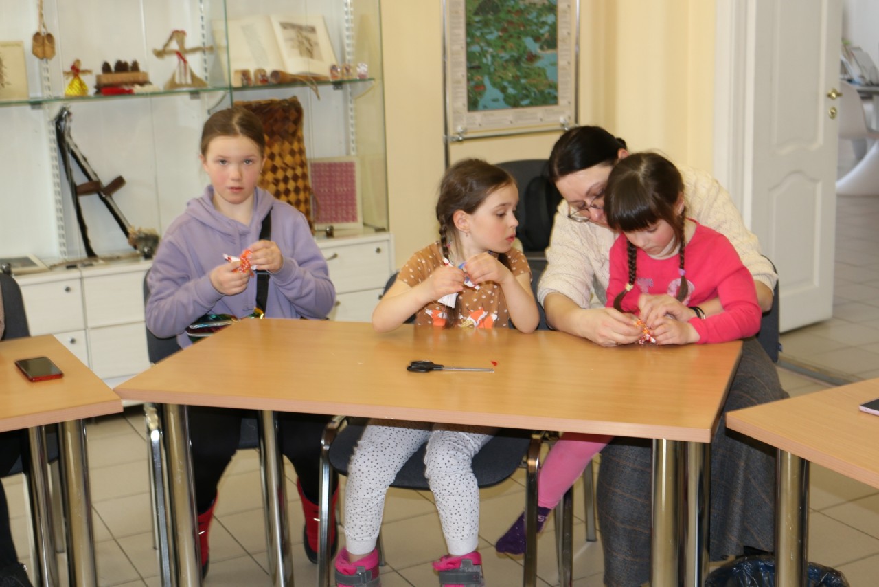 Оказывается, занятие по изготовлению куклы увлекательно для людей всех возрастов. Поэтому пришли от мала до велика, и мальчики и девочки, и по одному и семьями. Ишукова Т. В. рассказала и показала фильм о видах карельской куклы и их назначении. Зрители с интересом и удивлением открыли для себя много нового. Ведь обереговая кукла – это не просто голова, ручки и ножки. В ней вложен большой духовный смыл. О чём будешь думать во время создания куклы, такую энергию она и понесёт. Вот с добрыми мыслями все и приступили к работе. Гости очень старались. Взрослые помогали малышам завязывать узелочки. Несмотря на то, что материал у всех был одинаковый, куклы получились разные. Это и правильно. Ведь и мы все разные. Во все времена кукла не только оберегала и развлекала ребёнка, но и учила будущей взрослой жизни.