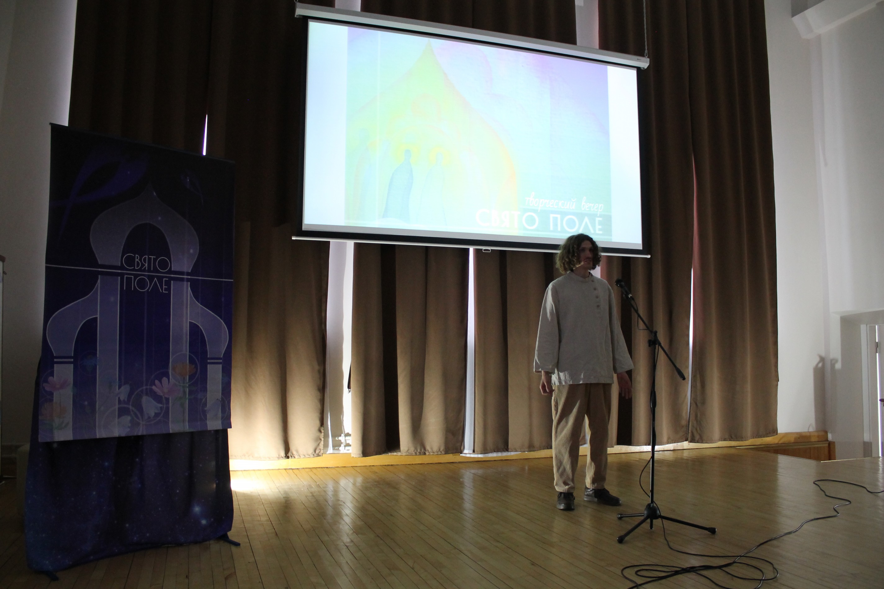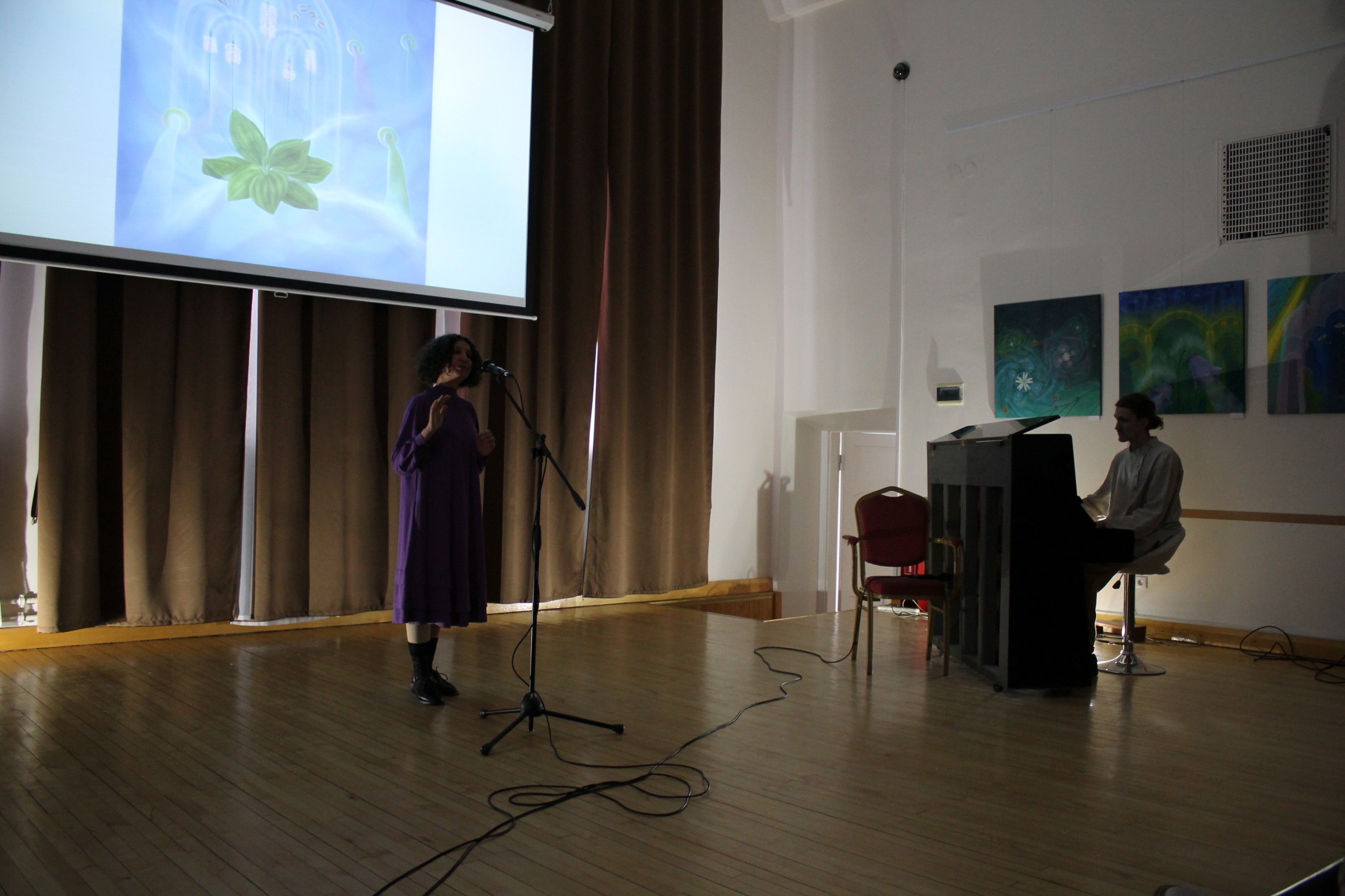 Художники работают над своими творческими проектами вместе, «в четыре руки». Это касается не только живописных полотен. На музыкально-поэтическом вечере был показан вариант подобного сотрудничества. На экране проектора появлялось изображение картины, представленной на выставке, и звучал творческий комментарий к ней: Юлия Лончакова читала стихи собственного сочинения, а Митя Нахай исполнял авторские мелодии.