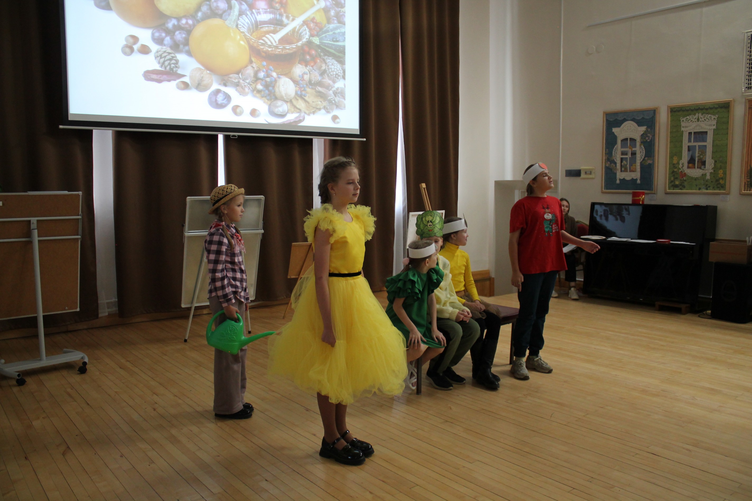Однажды к Художнику пришла Осень. Она была очень огорчена тем, что многие люди её не любят. Дни серые. Холодные дожди. Тоскливо и грустно. Чтобы убедить её, что она - красавица, Художник предложил Осени нарисовать её портрет. И пригласил на помощь юных зрителей праздника.