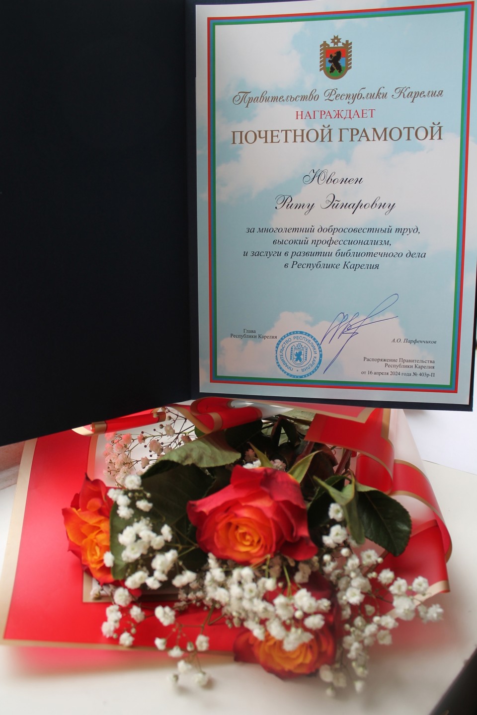 26 апреля первый заместитель Главы Администрации Сортавальского муниципального района Гришин Герман Александрович вручил почетные грамоты Правительства Республики Карелия за многолетний добросовестный труд, высокий профессионализм и заслуги в развитии библиотечного дела в Республике Карелия заведующему отделом обслуживания МБУ «Сортавальская МРБ» Леонтьевой Алевтине Юрьевне и заведующему детским отделом МБУ «Сортавальская МРБ» Ювонен Рите Эйнаровне.