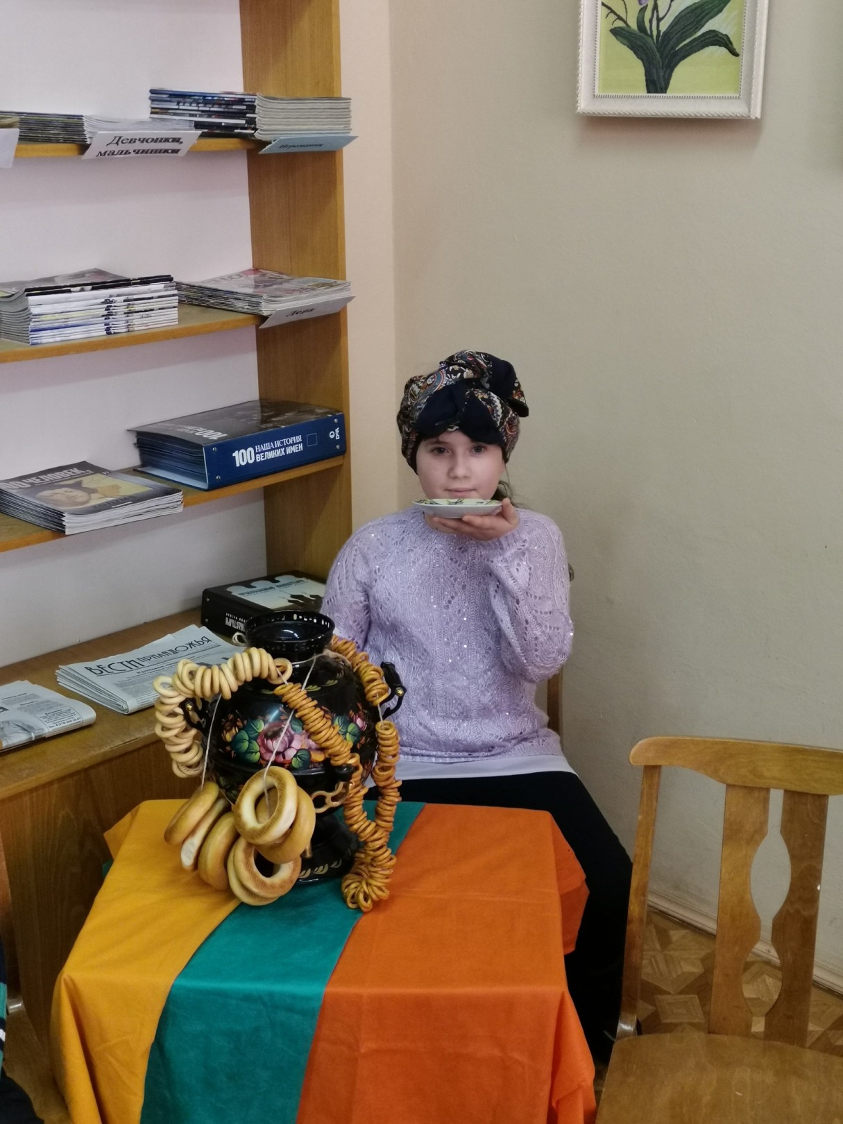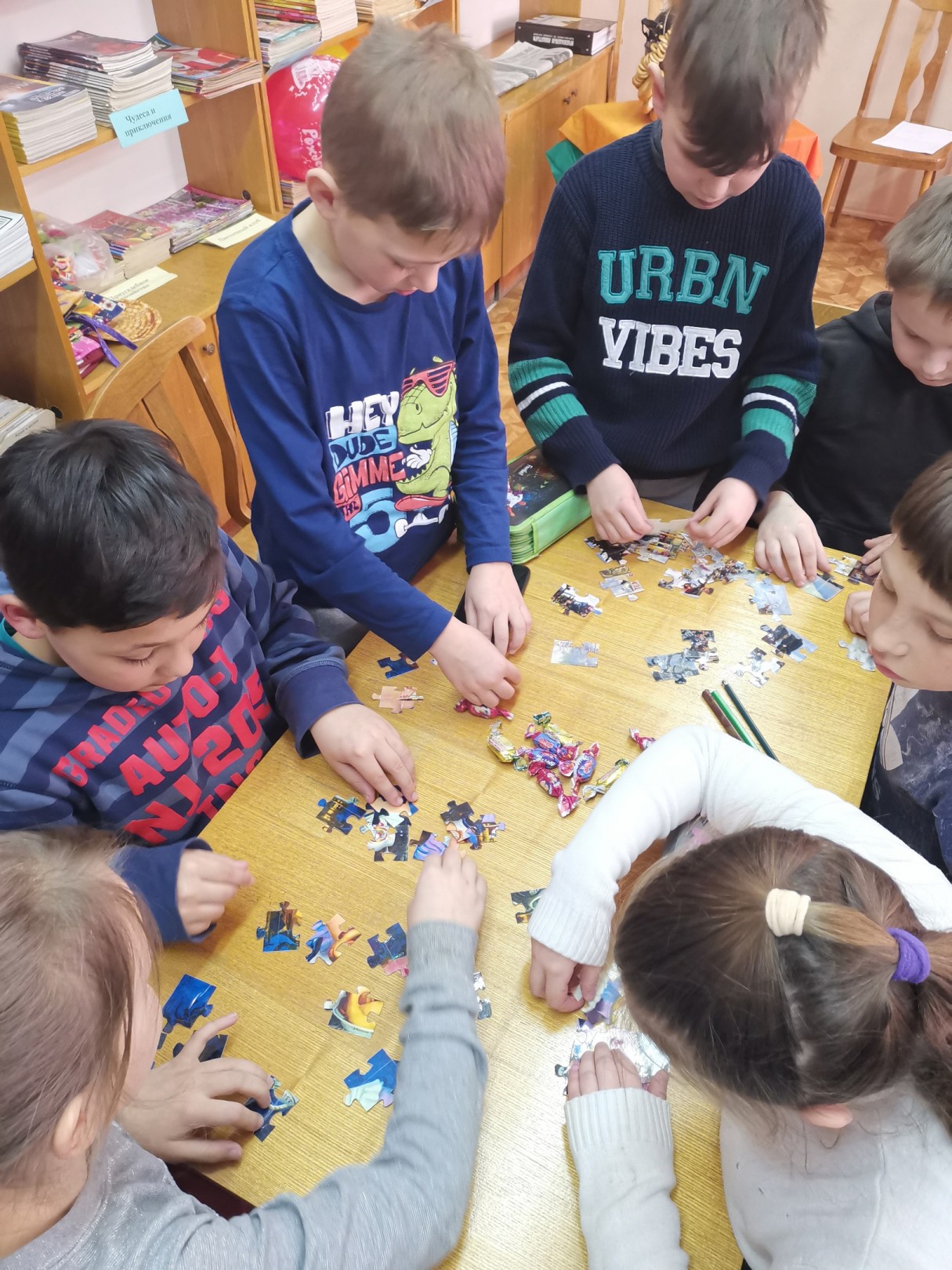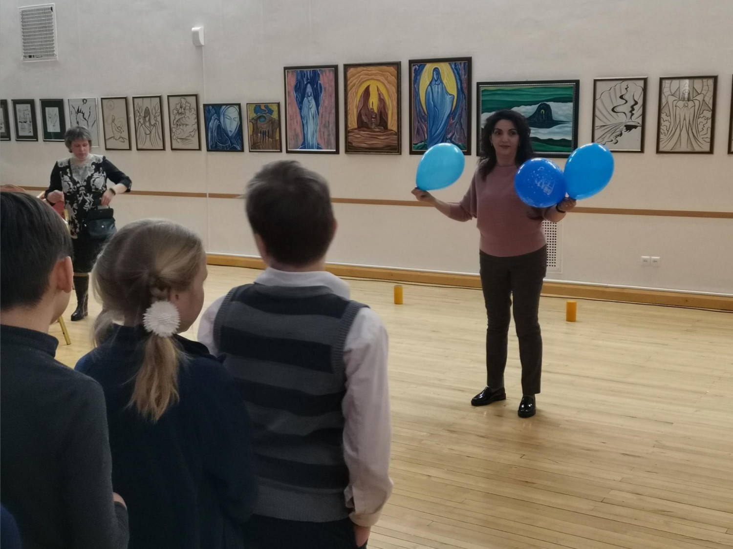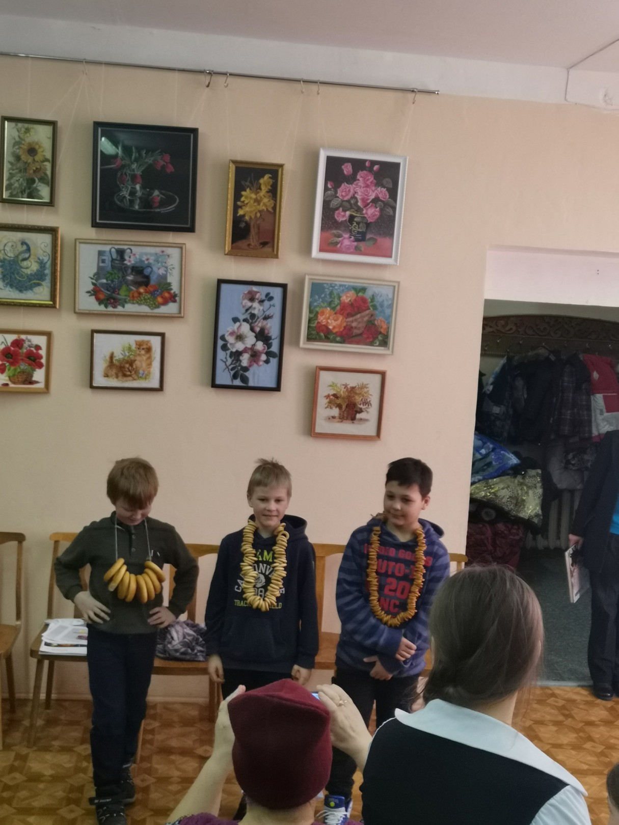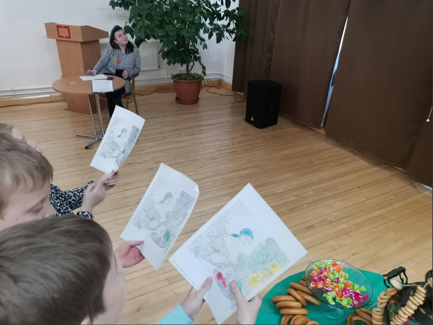 В третьей части участникам предстояло решить несколько заданий, направленных на развитие образного и логического мышления: найти 5 отличий в репродукциях «зимних» картин известных русских художников; собрать на скорость пазлы по двум полотнам Б. Кустодиева; раскрасить по памяти его знаменитую «Купчиху за чаем» и, наконец, показать, как завязан платок у этой героини. Ребята охотно принимали участие во всех конкурсах и играх, а в конце занятия получили заслуженные сладкие призы.