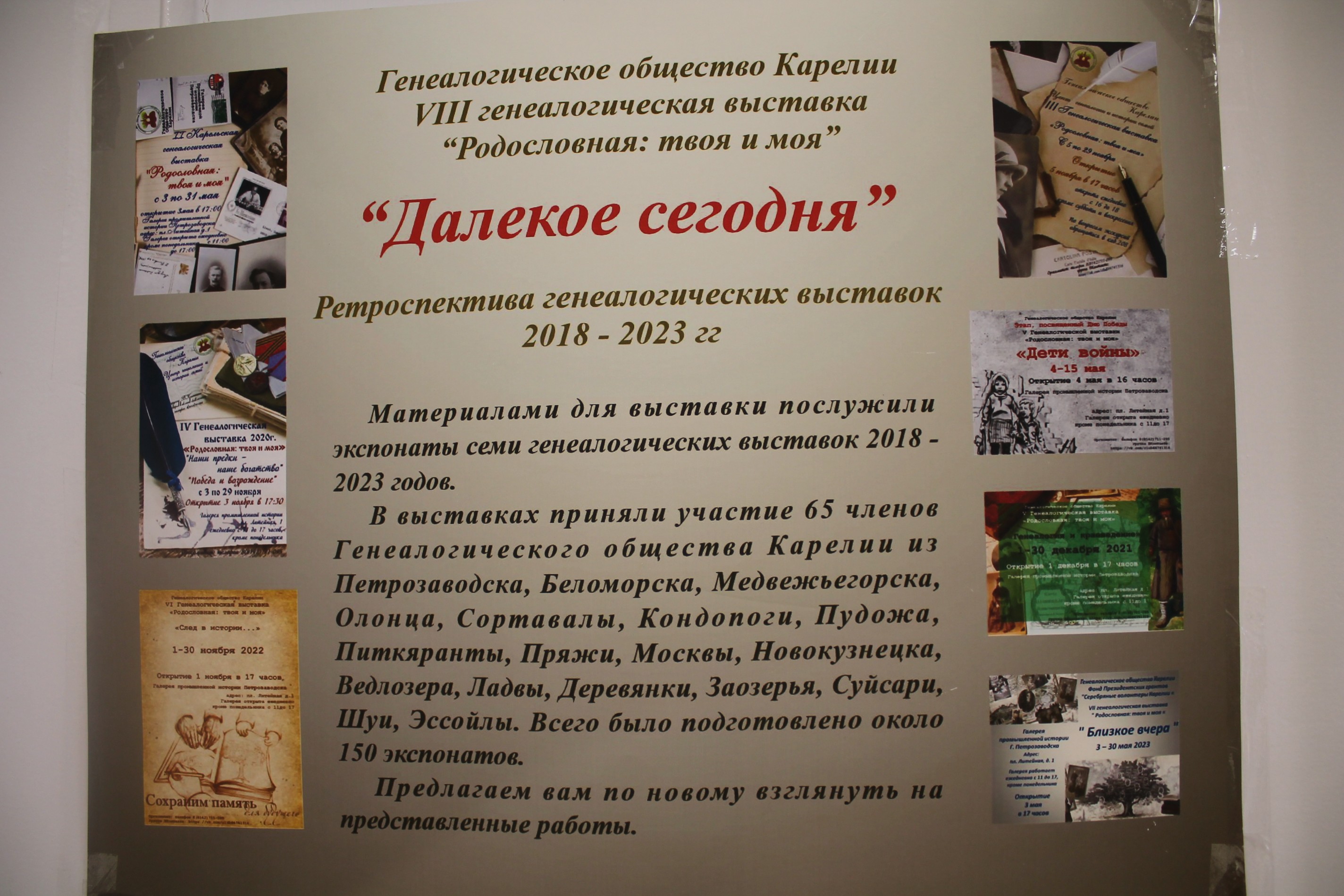 «Далёкое сегодня» - это ретроспектива генеалогических выставок 2018 – 2023 гг. Материалами для выставки послужили экспонаты семи генеалогических выставок. В выставке приняли участие 65 членов Генеалогического общества Карелии из Москвы, Петрозаводска, Сортавала, Пудожа, Пряжи, Беломорска, Кондопоги, Питкяранта, Новокузнецка и других. Всего было подготовлено около 150 экспонатов.