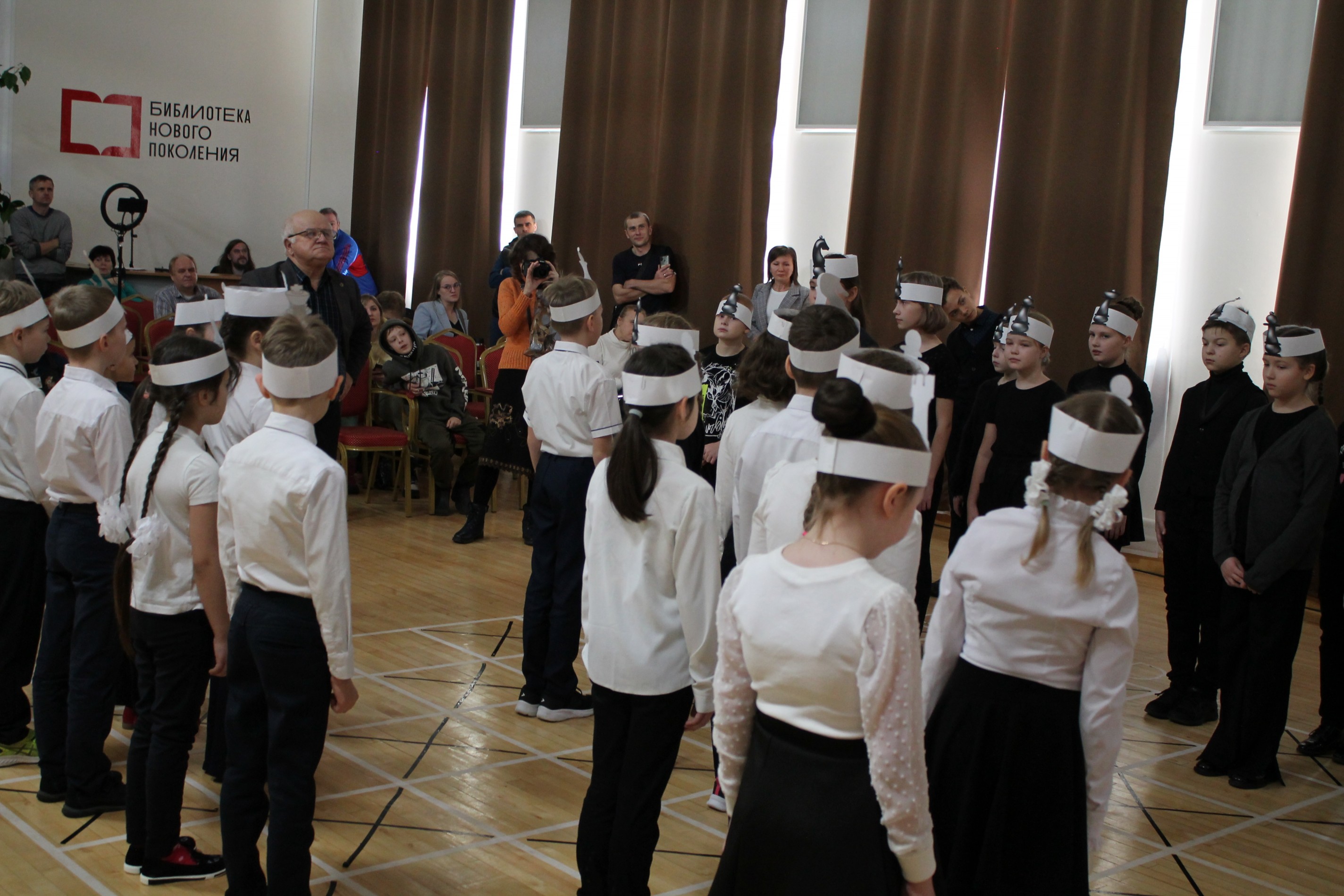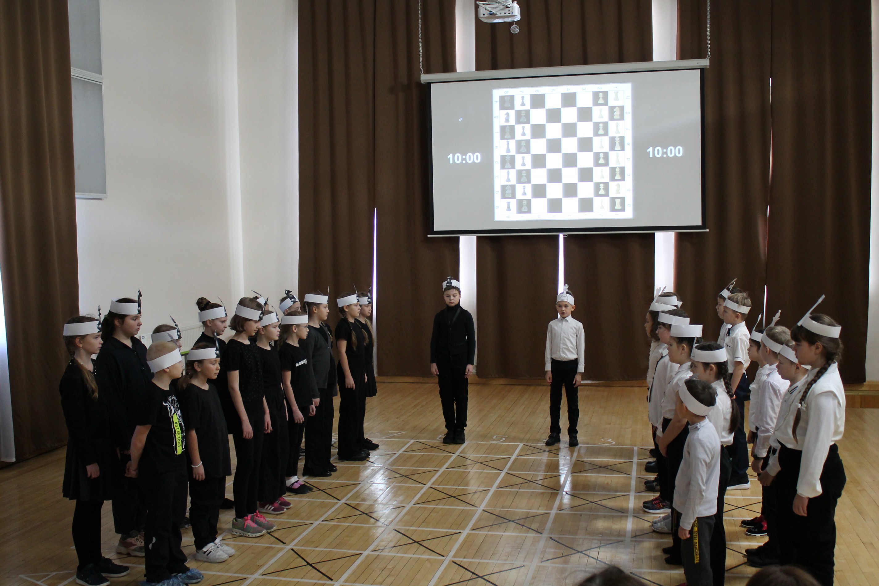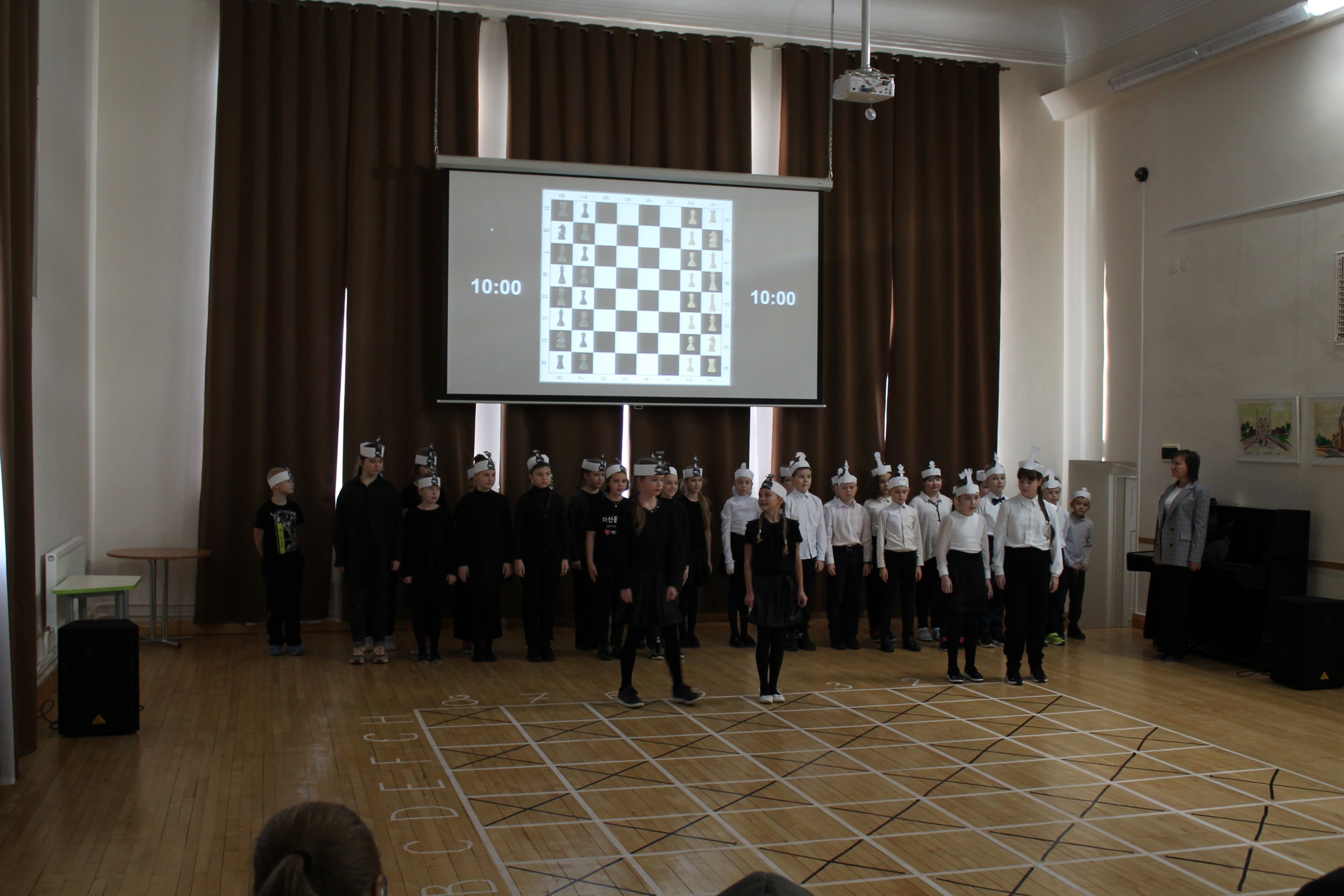 Роли шахматных фигур исполнили учащиеся начальных классов Средней школы №1 города Сортавала.