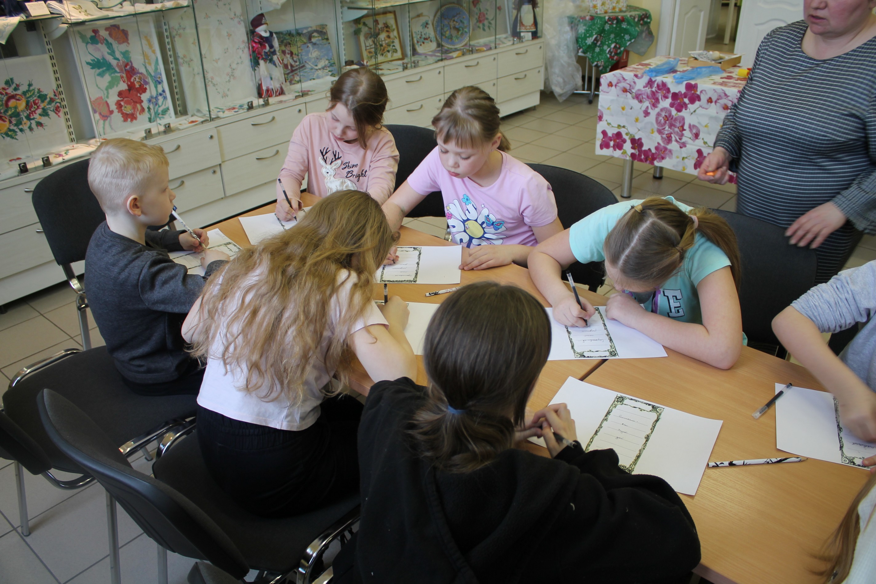 Далее юные художники приступили к оформлению эксклюзивного буклета. Внутри него располагается текст «Сортавала - мой родной дом», написанный ребенком от руки. Его внешняя сторона украшена линографическим оттиском, создать который детям помогла Елена Михайловна Шинкевич, учитель средней школы №7.