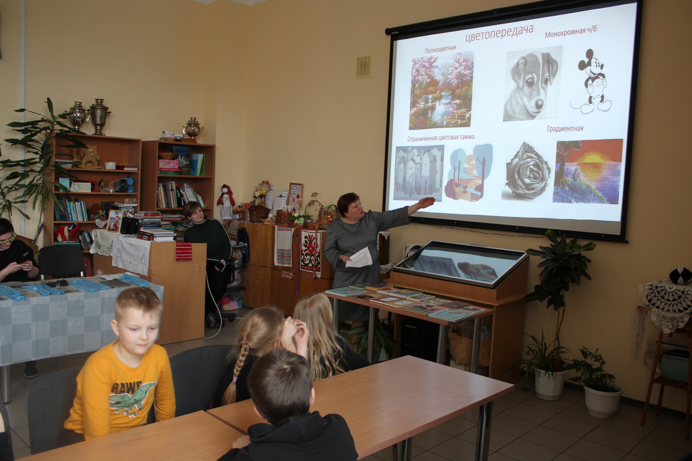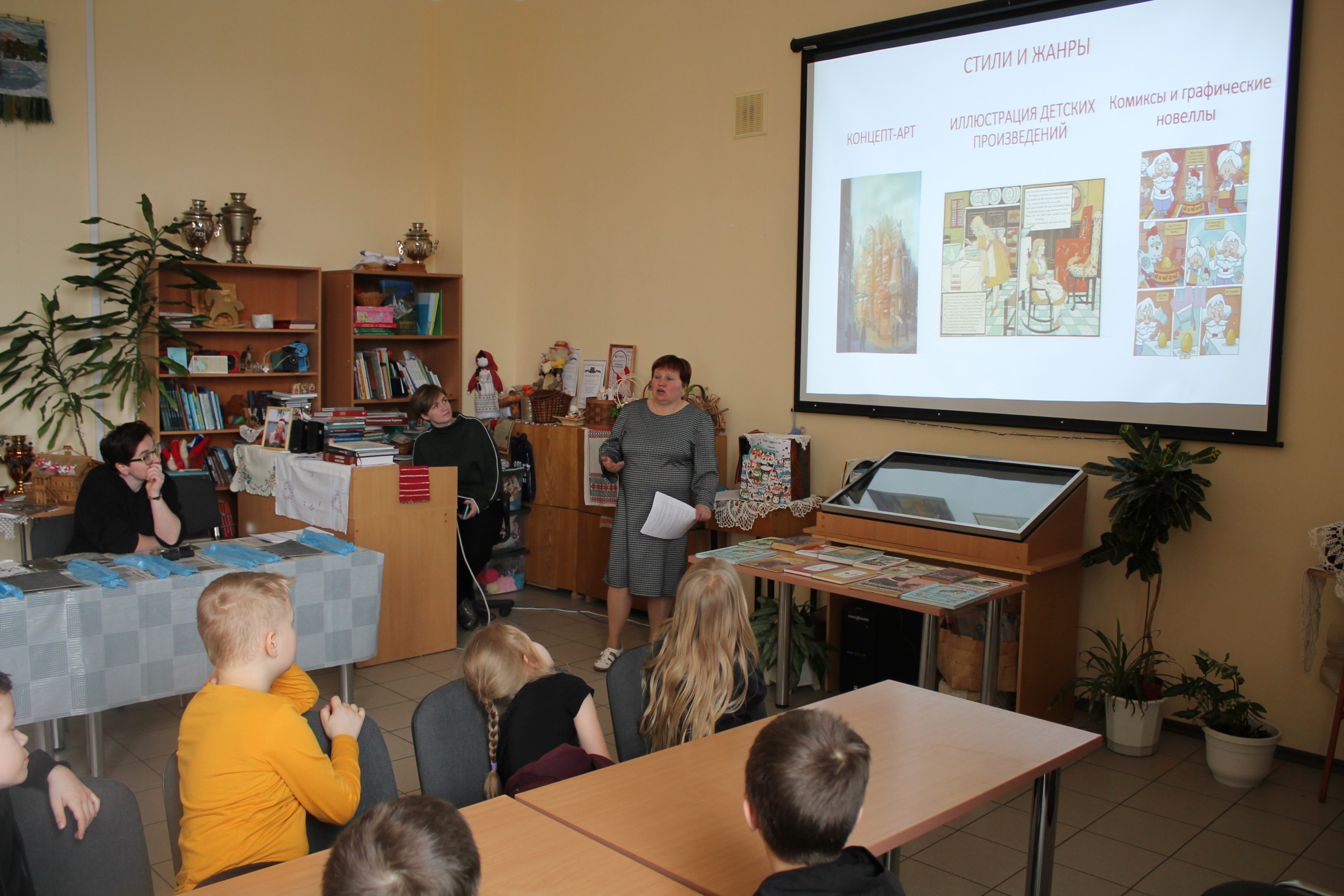 Библиотекарь детского отдела Елена Анатольевна Перминова рассказала юным посетителям об известных художниках-иллюстраторах, особенностях этой профессии, различных стилях и техниках исполнения рисунков к литературным произведениям.
