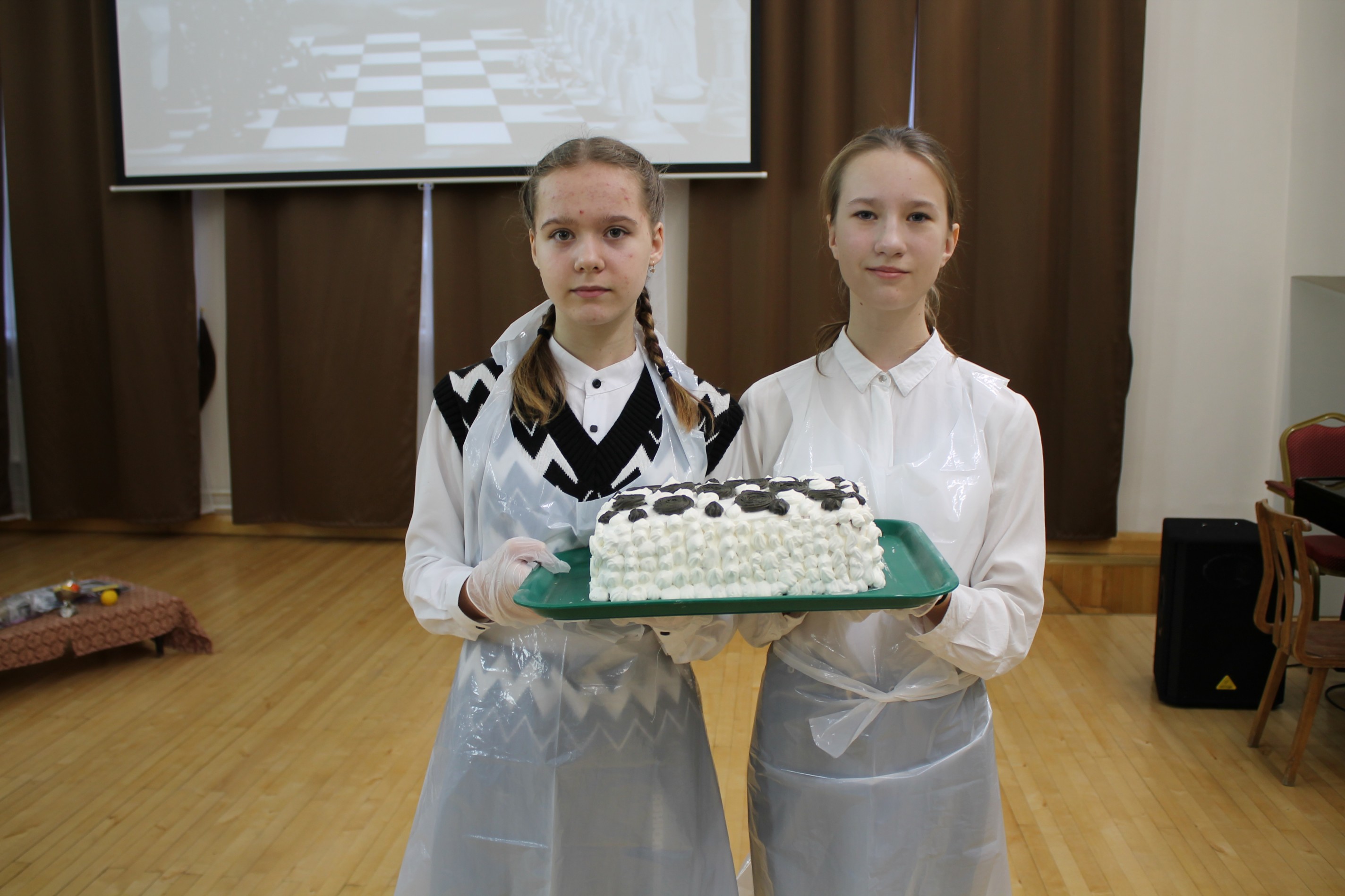 Сладкой точкой праздника стал торт в стиле шахматной доски, выполненный восьмиклассниками Средней школы №6 и их педагогом Романовой Ириной Владимировной.