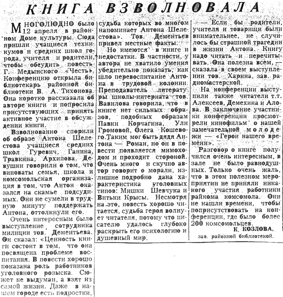 12 апреля в районном Доме культуры состоится читательская конференция по книге Г. Медынского "Честь".