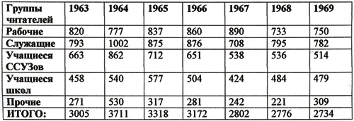 Состав читателей. Большинство - служащие (1002 чел.), учащиеся ССУЗов, рабочие.