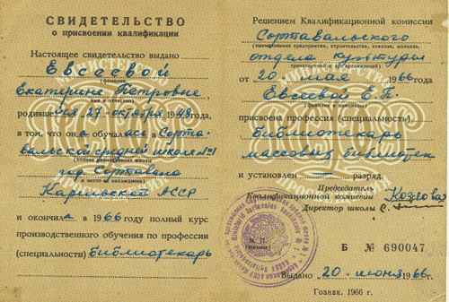 На основании протокола о сдаче экзаменов по библиотечному делу от 27 декабря 1965 года присвоить квалификацию БИБЛИОТЕКАРЬ следующим учащимся Сортавальской средней школы №1: