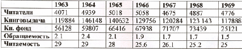 Но к концу 60-х количество читателей снижается по объективным причинам: уволилась заведующая абонементом, и в течение 8,5 месяцев длилась передача фонда, долгое время по семейным обстоятельствам отсутствовала заведующая передвижным фондом - это сказалось и на показателях работы передвижек.