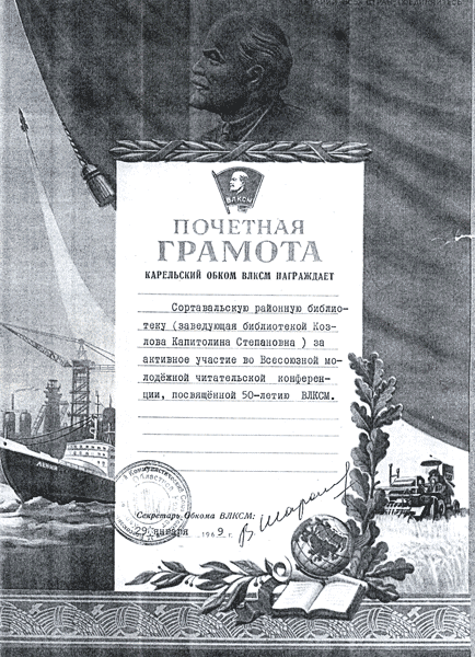 Копия грамоты за активное участие во всесоюзной читательской конференции