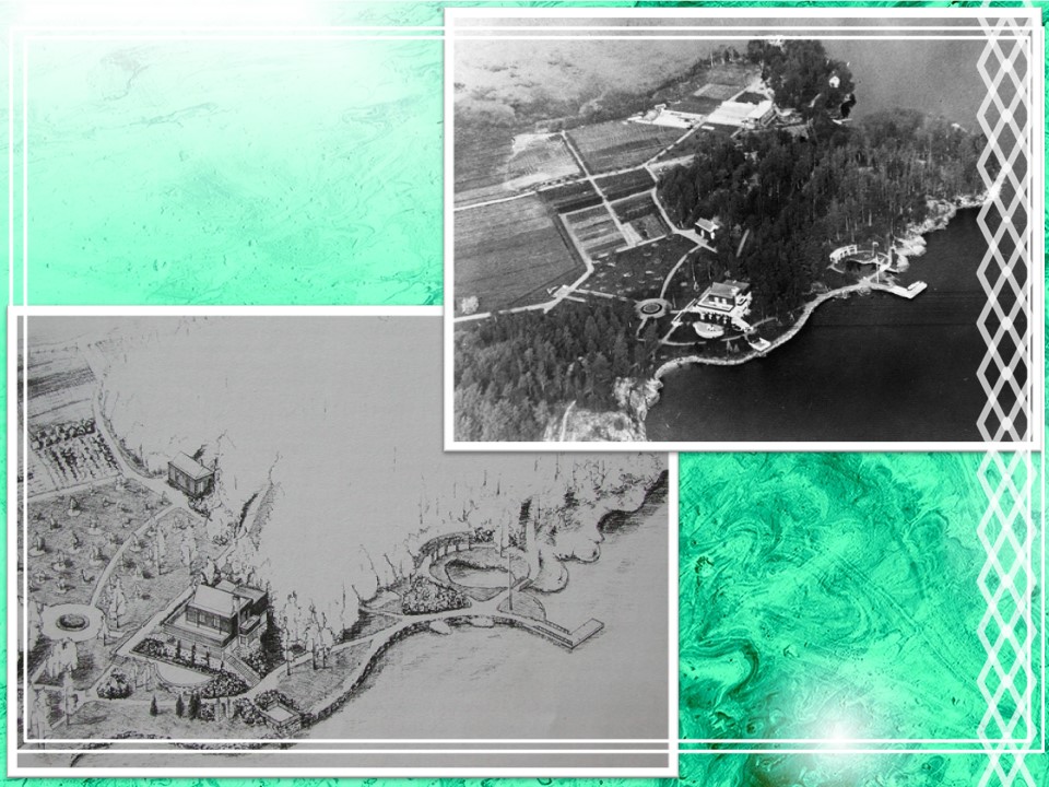 Аккуратные дорожки, чередование газонов, площадок и живых изгородей вокруг усадьбы, беседка-пергола, дом, небольшая гавань с горбатым мостиком, теплицы – всё это создавало неповторимый архитектурно-ландшафтный ансамбль и идеальное место для прогулок.