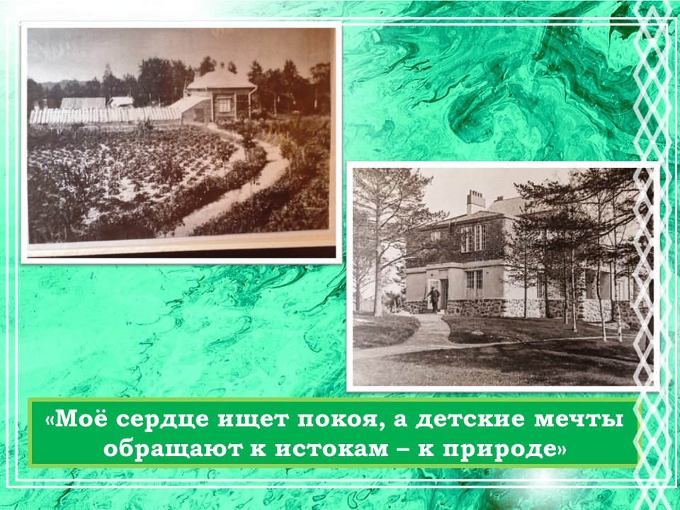 «Таруниеми – любимое и самое дорогое для меня место. Здесь, в тиши и покое, меня посещали самые лучшие мысли и намерения, здесь рождались проекты будущего устройства, здесь прижилось домашнее счастье и тепло моего сердца!