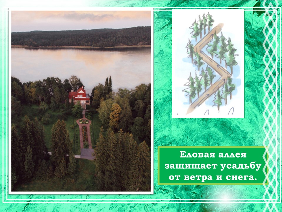 Именно ели европейские обыкновенные составляют аллею – живую изгородь, которая отделила усадьбу от всего мира и сохранила её камерность. Еловая аллея защищает усадьбу от ветра и снега.