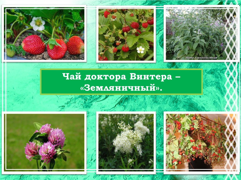 Чайные сборы Густава Винтера со временем превратился в местную легенду. Один из них – земляничный. Рецепт доктора Винтера: берётся травяной сбор листьев клубники и земляники, затем сбор мяты длиннолистой, соцветия клевера красного, лист и цвет таволги отлично дополняют сушёные ягоды клубники и земляники.