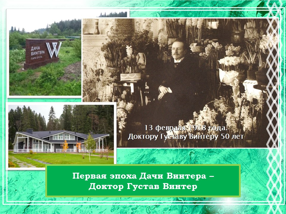 Главным увлечением в жизни Густава Винтера было садово – парковое искусство. Именно это увлечение накрепко связала его имя с суровой красотой здешних мест, которая притягивала сюда представителей интеллигенции.