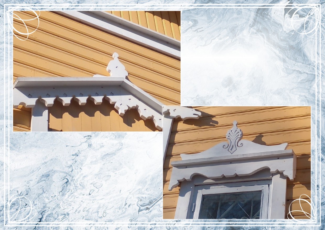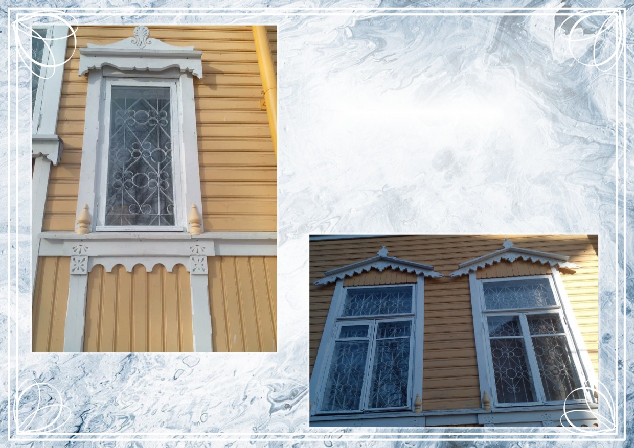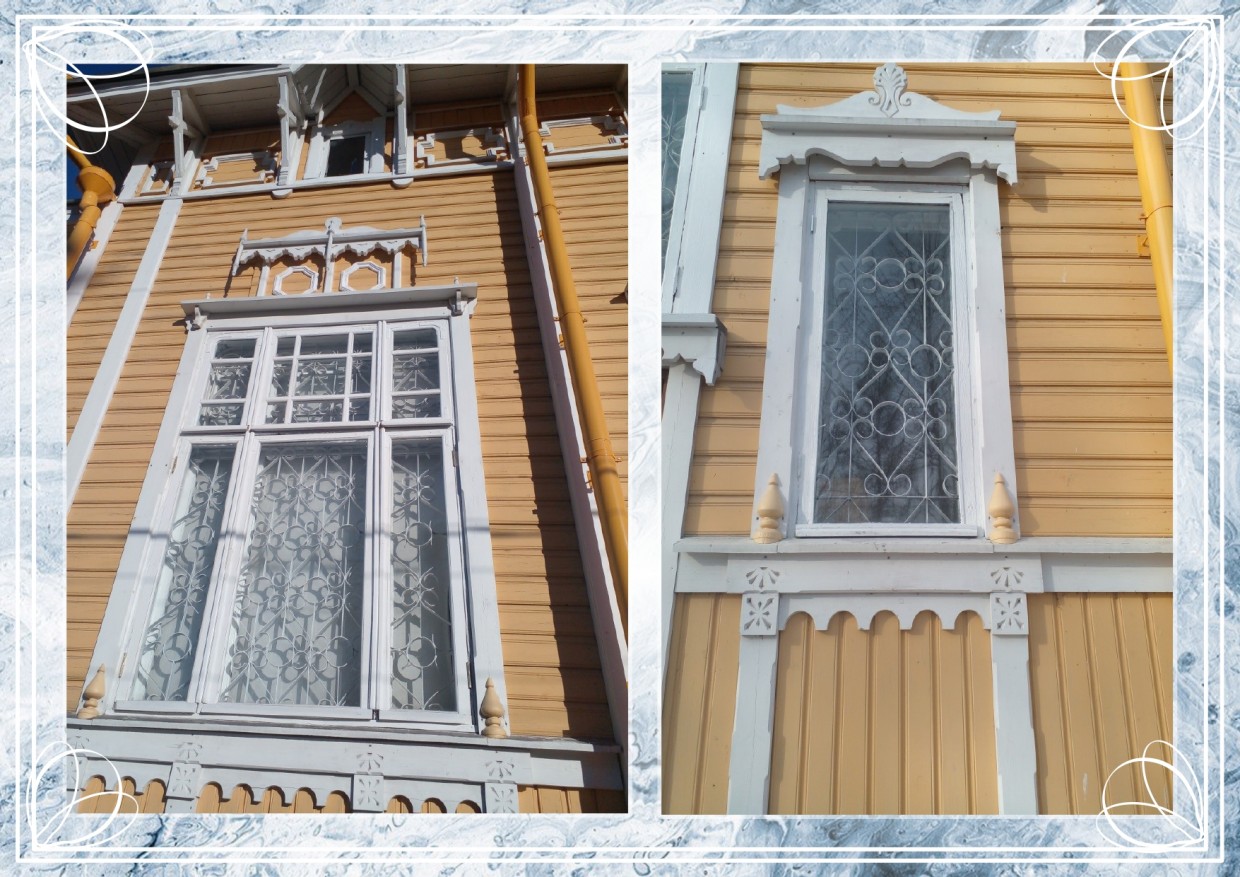 Декоративное оформление здания – одно из самых сложных среди деревянных жилых построек города. Окна богато оформлены глухой и ажурной резьбой с деталями растительного и зооморфного характера, где можно рассмотреть и орла, и китов.
