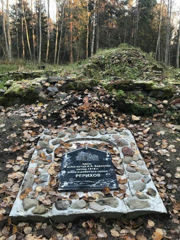 Плита черного карельского гранита, выполненная специалистами компании «Гранит Выборг» по проекту художников Владимира Головачева и Ирины Романовой установлена на месте дома, где жил Рерих.