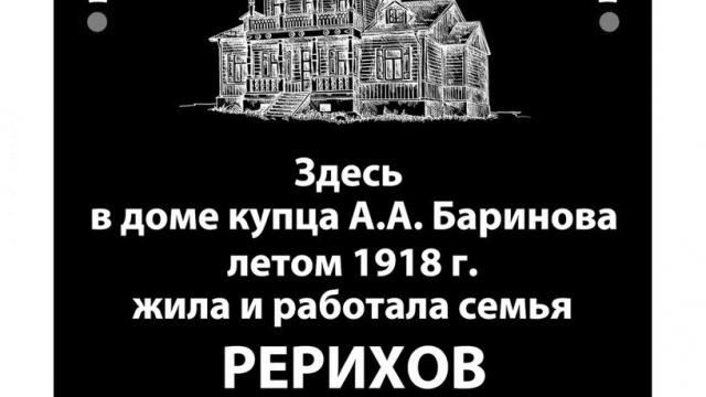 Надпись гласит: «Здесь в доме купца А.А. Баринова летом 1918 г. жила и работала семья Рерихов».
