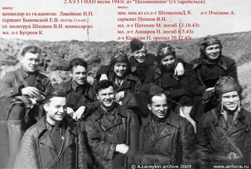 «Вот она на фото, поющая эскадрилья. Такие вот «старики»... Гвардии капитан Лавейкин, вверху, чернявый, сержант Попков, впоследствии генералы и Герои Советского Союза - красивый парень рядом с Лавейкиным - сержант Быковский. Да все они герои и красавцы-парни…»