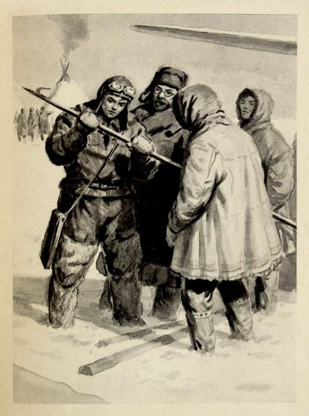 Я первый увидел брезентовую лодку, то есть, вернее, понял, что этот сплющенный блин, боком торчащий из размытой земли, — лодка, да ещё поставленная на сани. В ней лежали два ружья, какая-то шкура, секстант и полевой бинокль, всё заржавленное, заплесневелое, заросшее мхом... На некоторых вещах ещё можно было разобрать круглую печать «Зверобойная шхуна «Св. Мария» или надпись «Св. Мария». Но этот лагерь был совершенно пуст — ни живых, ни мёртвых»...
