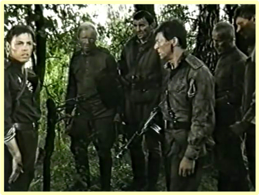 Четверо солдат в измазанных землей, захлюстанных шинелях, грубо, буйно заросшие щетиной, с автоматами на коленях, расположились под плетнем на дворе, жадно затягивались; напротив, держа кисет, присел на корточки часовой.»